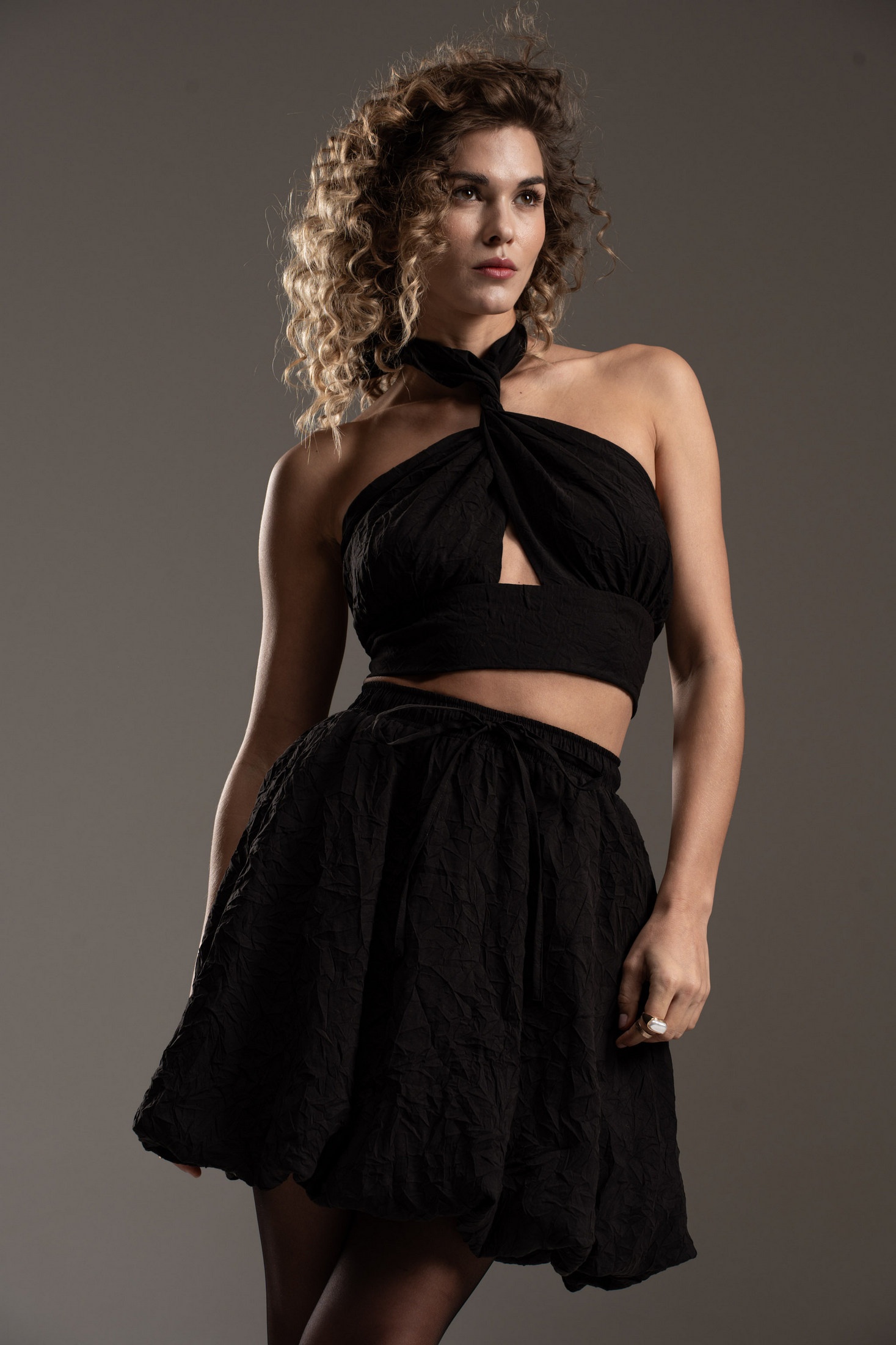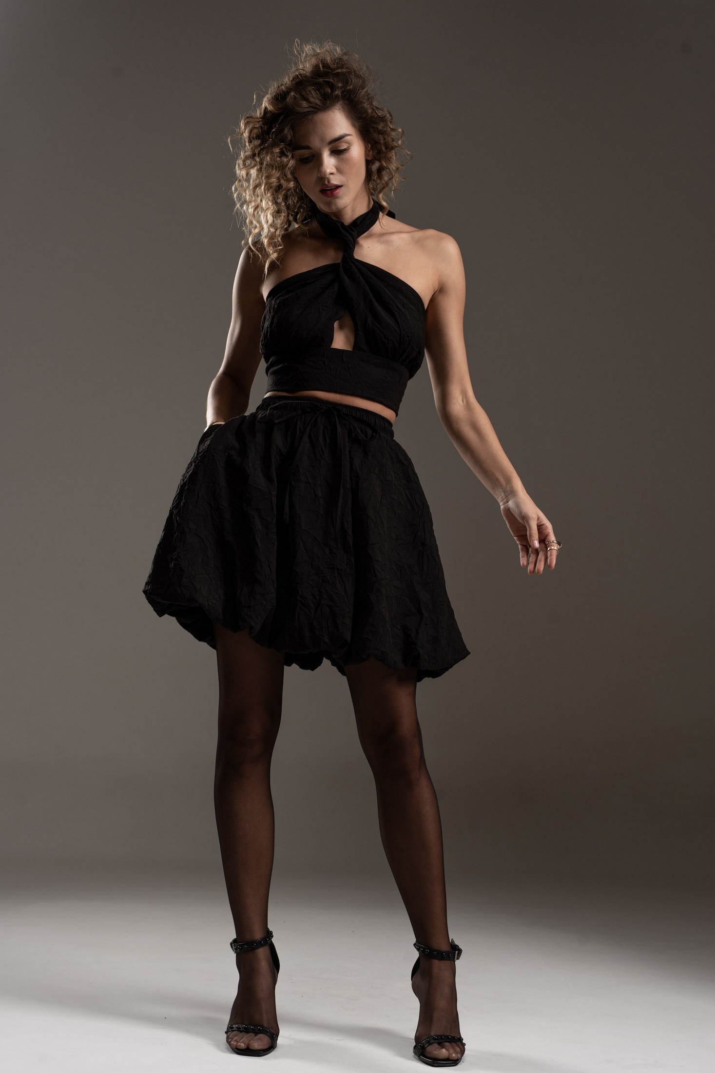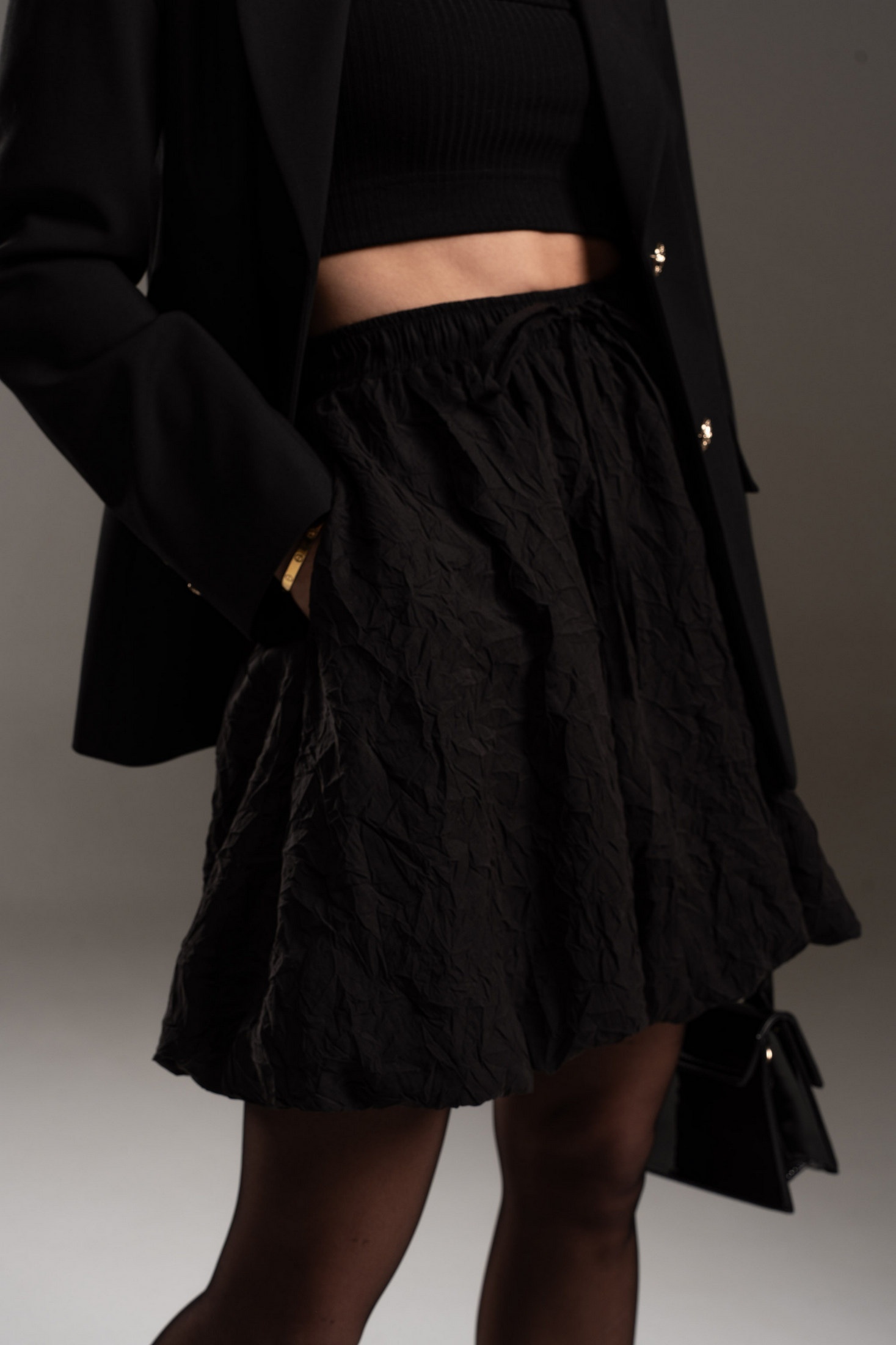 Юбка мини баллон из "жатой" вискозы, цвет черный. Продуманный A-образный силуэт и отрезной пояс на эластичной резинке с кулисой добавляют комфорта и стиля. Практичные карманы в боковых швах увеличивают функциональность. Общая длина изделия с поясом составляет 47 см. Эта модель идеально подойдет для создания современного и выразительного образа.