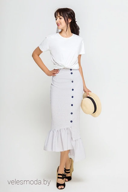 Юбка женская прилегающего силуэта, без подкладки. Ткань в мелкую синюю полоску, с эффектом жатки. По переду таллиевая вытачка, застёжка на петли и пуговицы, застёжка смещена к левому боковому шву. Застёгивается на петли и пуговицы. По задним половинкам по линии талии вытачки. Верхний срез юбки обработан притачным поясом, застёгивается на петлю и пуговицу. Низ юбки не симметричный. По низу юбки притачной волан, ширина волана 20 см. Длина юбки по середине спинки с учётом ширины волана 84 см (±1 см).