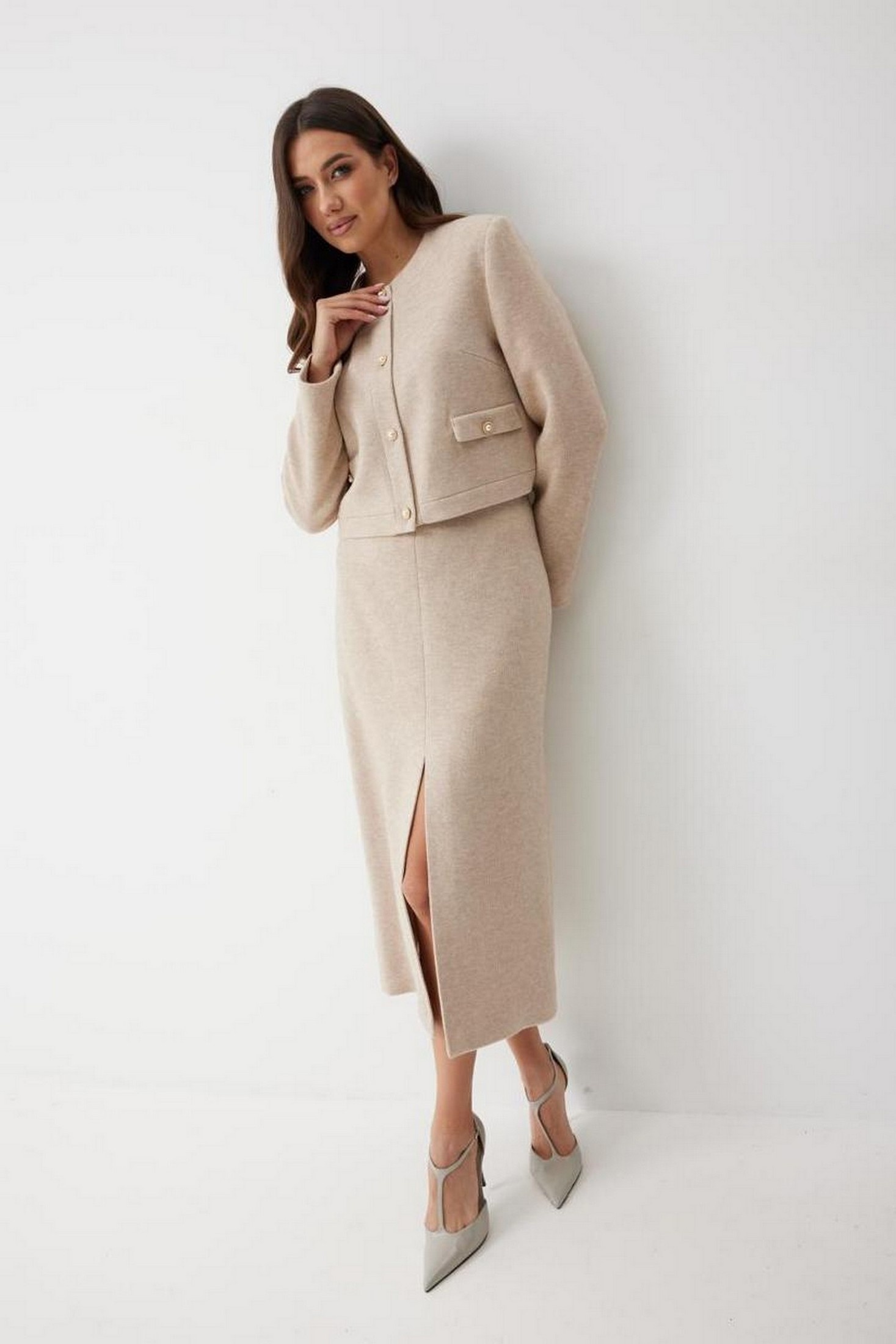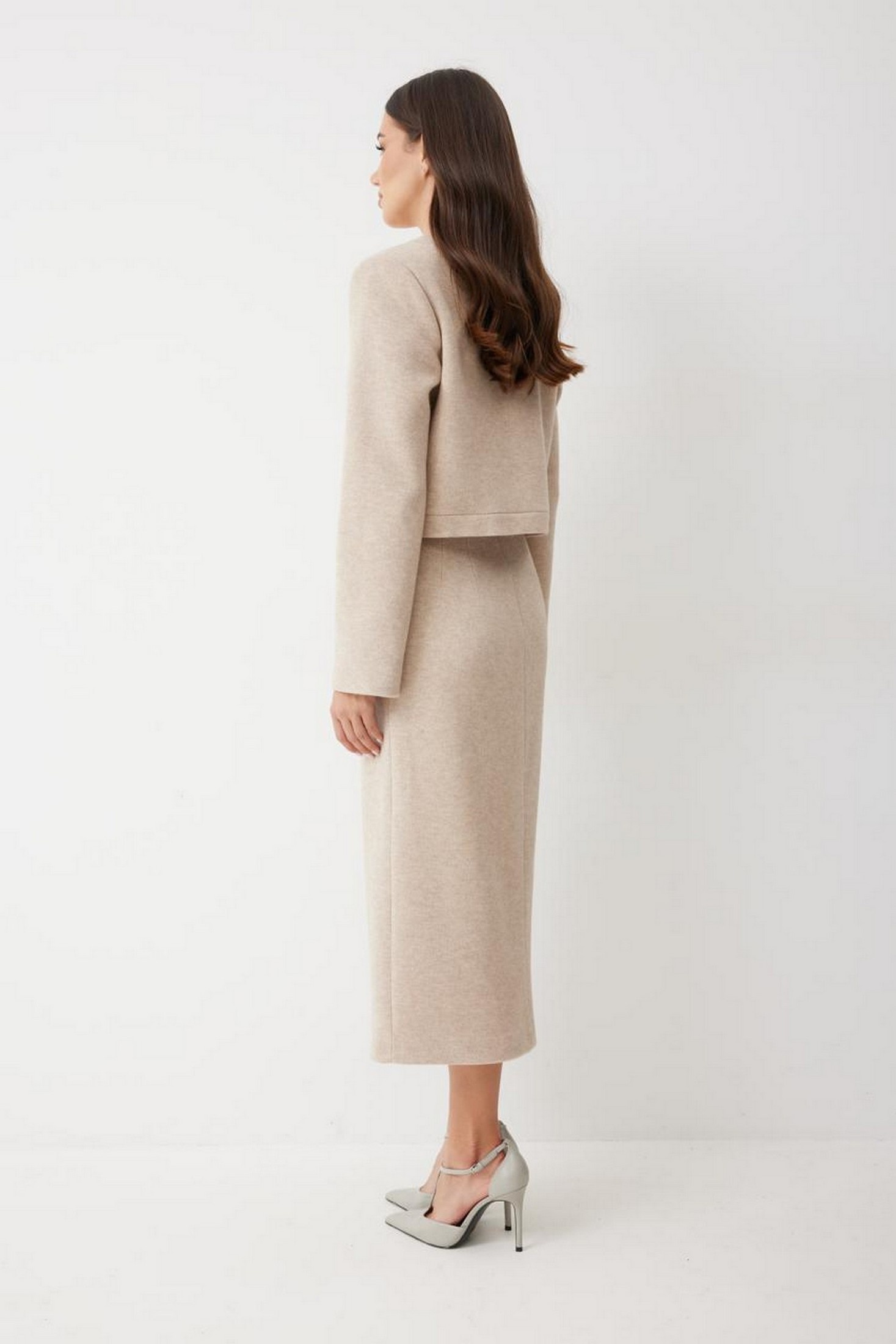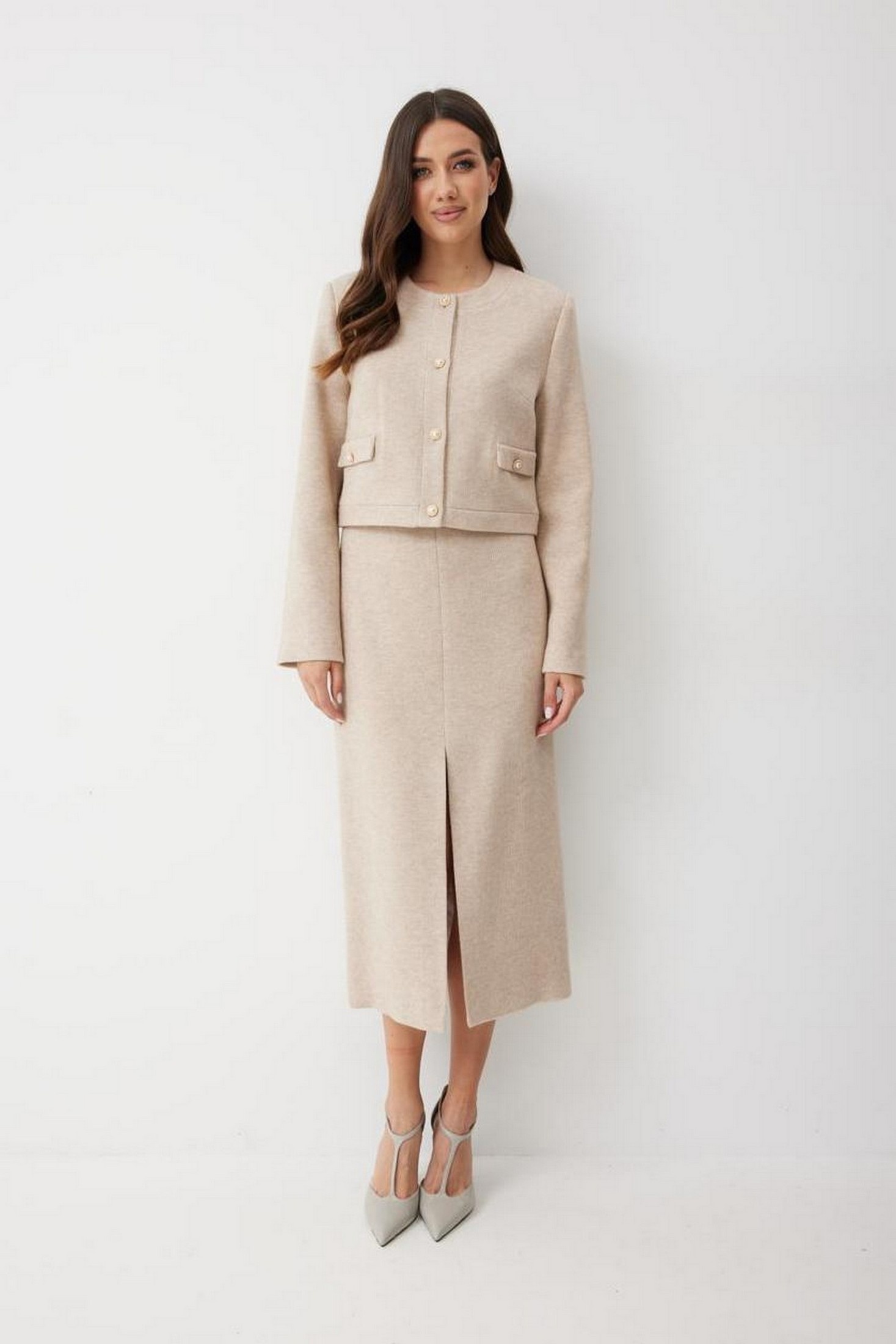 Женская юбка - карандаш длиной миди с посадкой на талии, выполнена из трикотажного полотна. Модель имеет прямой крой и аккуратную посадку по фигуре, подчёркивая силуэт и оставаясь при этом удобной в носке. По переднему полотнищу средний шов, заканчивающийся высоким разрезом, длиной 43 см, который добавляет женственность и комфорт при движении. Пояс притачной, застежка на потайную молнию в среднем шве сзади. Юбка на поливискозной подкладке.