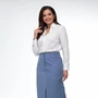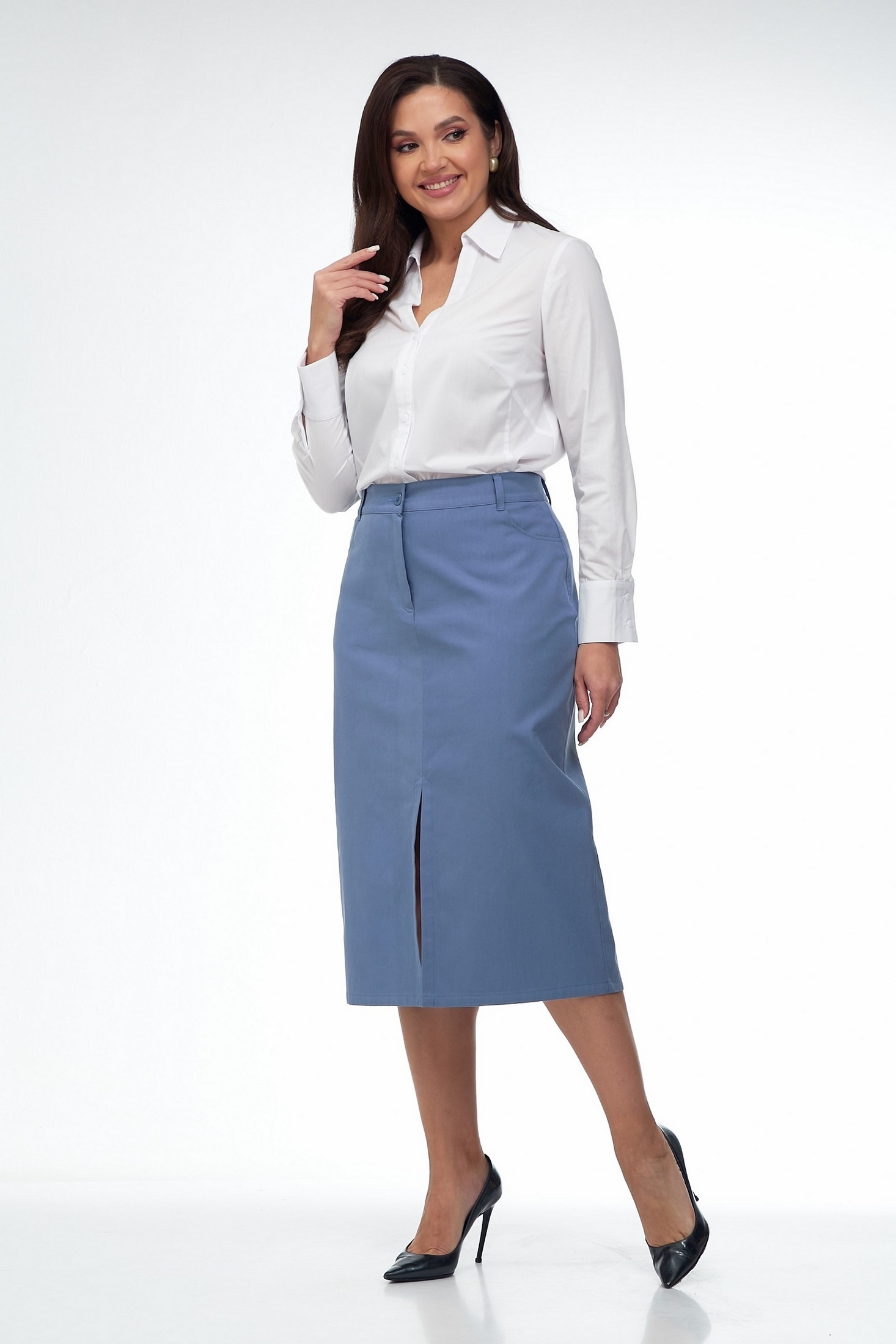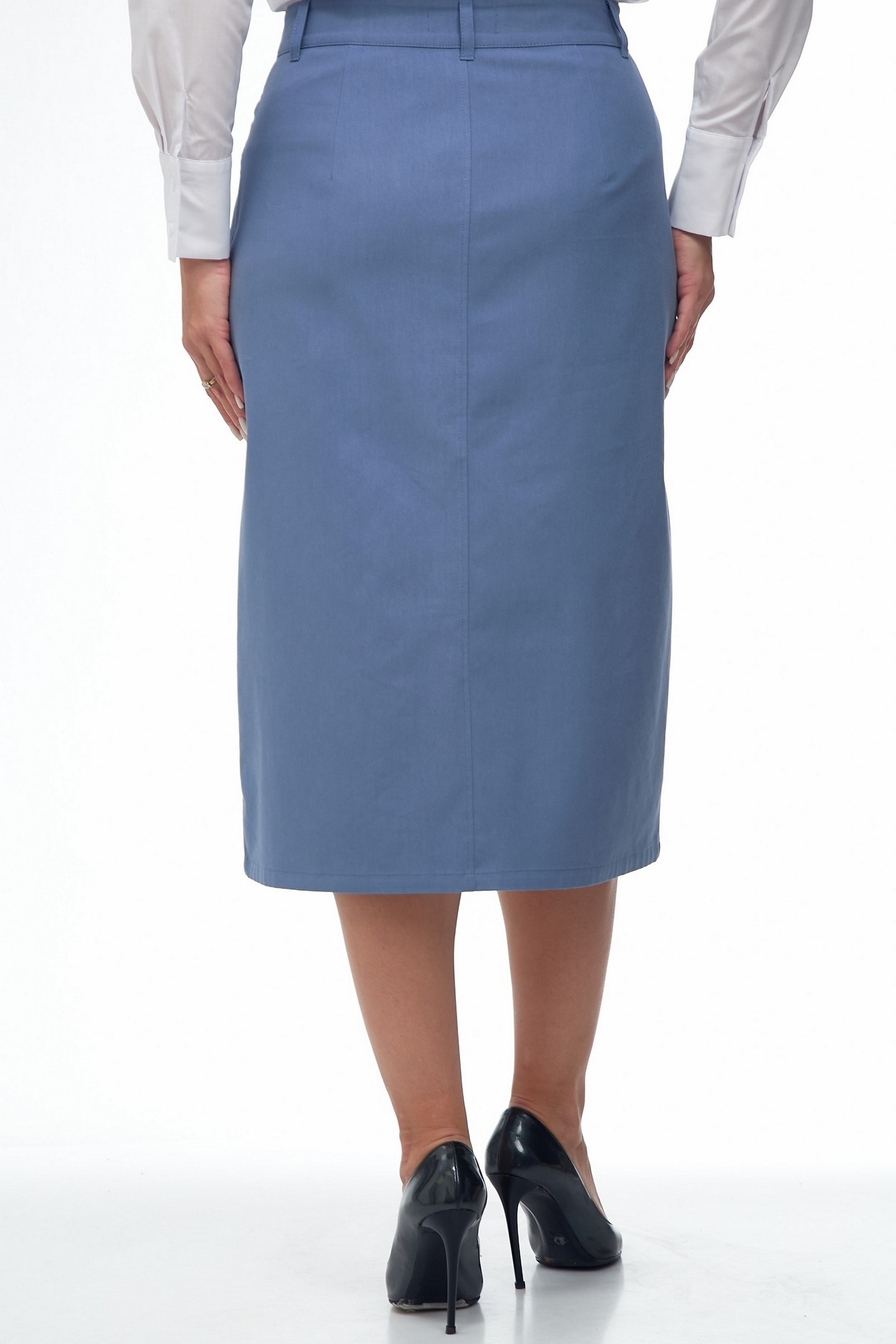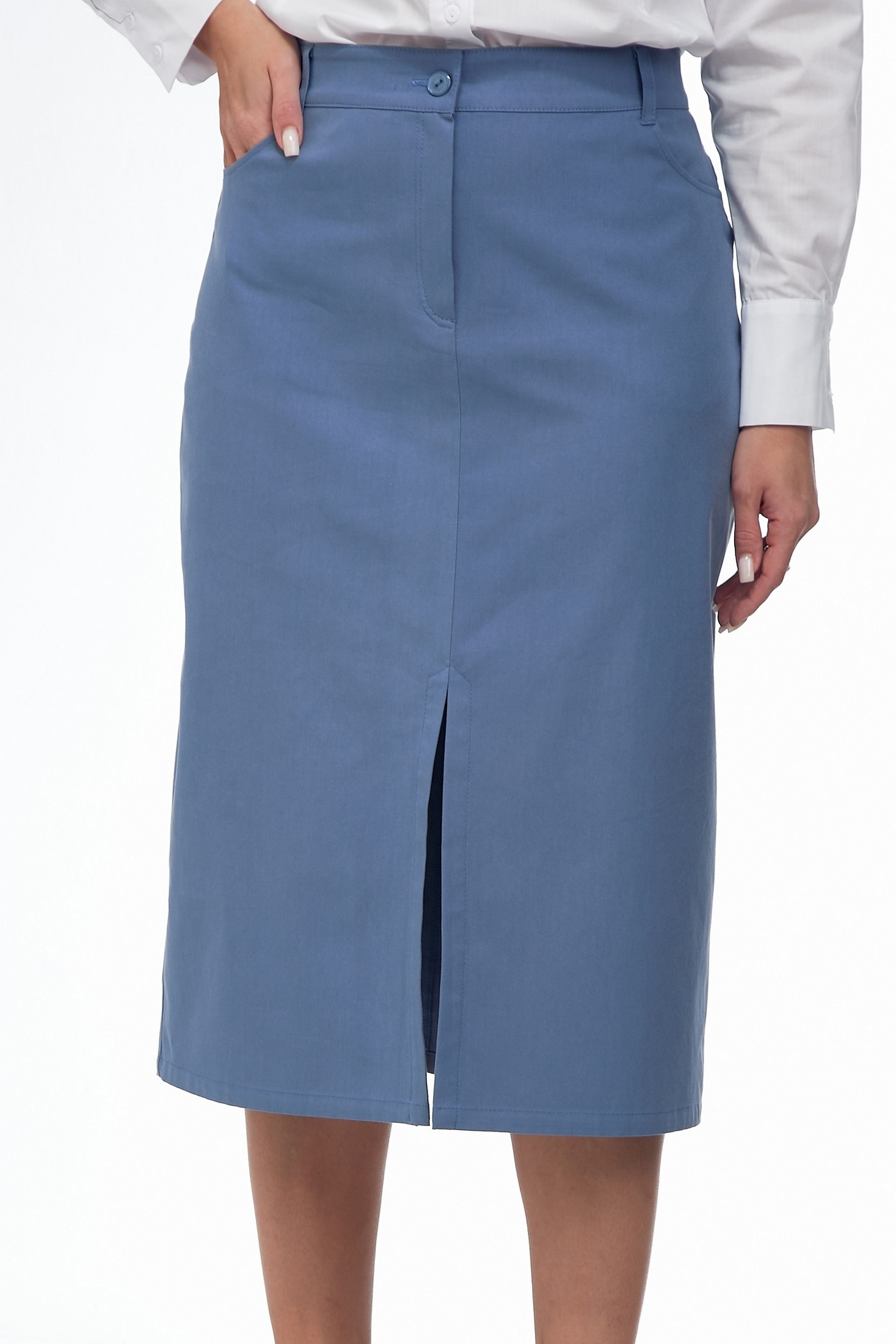 Элегантная юбка прямого силуэта из костюмной ткани серо-голубого цвета. Модель оснащена удобным поясом, декоративными петлями и пуговицами для стильного и функционального акцента. Два вместительных кармана на передней стороне добавляют практичность, в то время как застежка-молния спереди удобна в использовании. Юбка дополнена разрезом для свободы движения, подчеркивая современный вид. Длина модели составляет 80 см, что делает её идеальным выбором как для офиса, так и для вечерних мероприятий.
