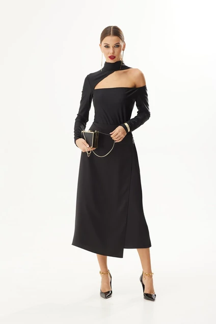Юбка на запах из атласной ткани. Длина миди. Застежка на пуговицу в правом боковом и на пряжку полукольцо в левом боковом. Верх на обтачке. Заднее полотнище юбки на подкладке.