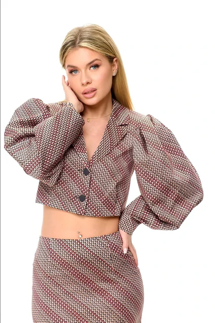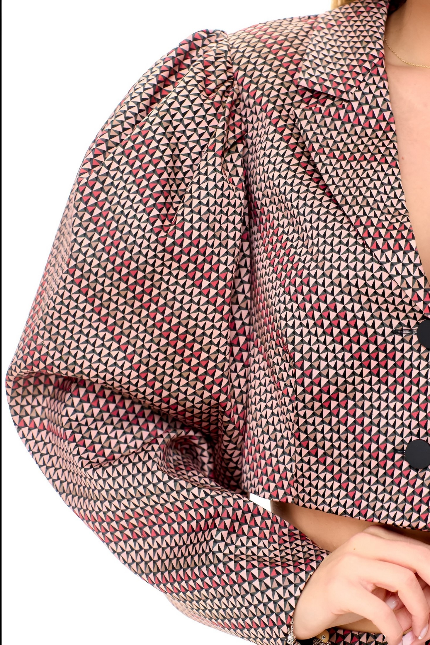 Жакет 5019-1 Abbi — изысканное дополнение вашего гардероба. Коллекция бренда Abbi предлагает кроп-жакет, выполненный из премиального турецкого хлопка с микропринтом в бежево-бордовых тонах. Плотная ткань с костюмной фактурой обеспечивает комфорт и износостойкость. Подкладка из 100% полиэстера и мягкие поролоновые подплечники поддерживают четкую посадку. Пышные рукава-буфы добавляют женственность, а укороченный фасон акцентирует линию талии. Отложной воротник и крупные пуговицы подчеркивают классический стиль модели. Жакет подходит для весеннего и осеннего сезонов, идеально комбинируется с изделиями высокой посадки, в сочетании с деловым или вечерним образом.
