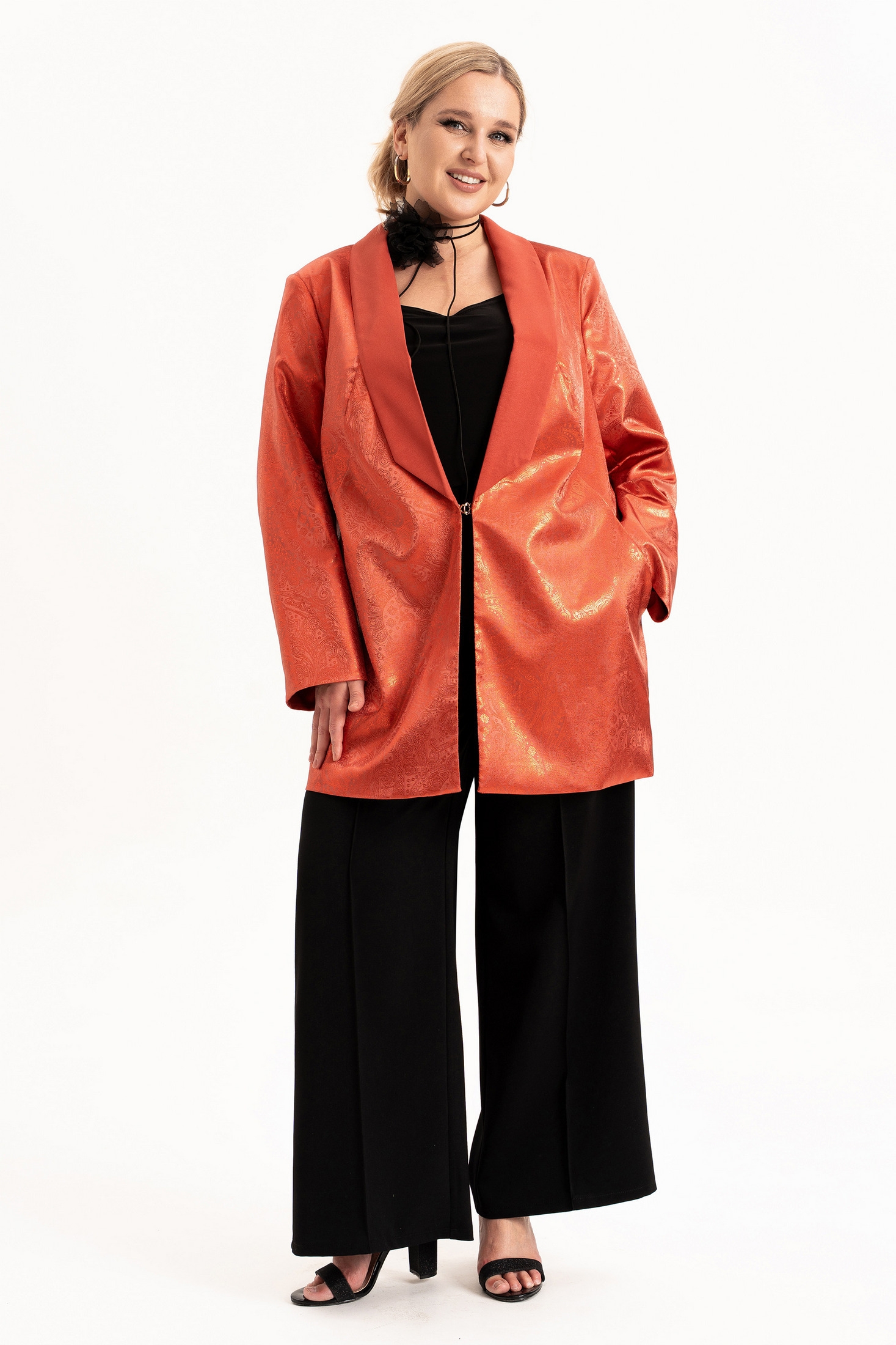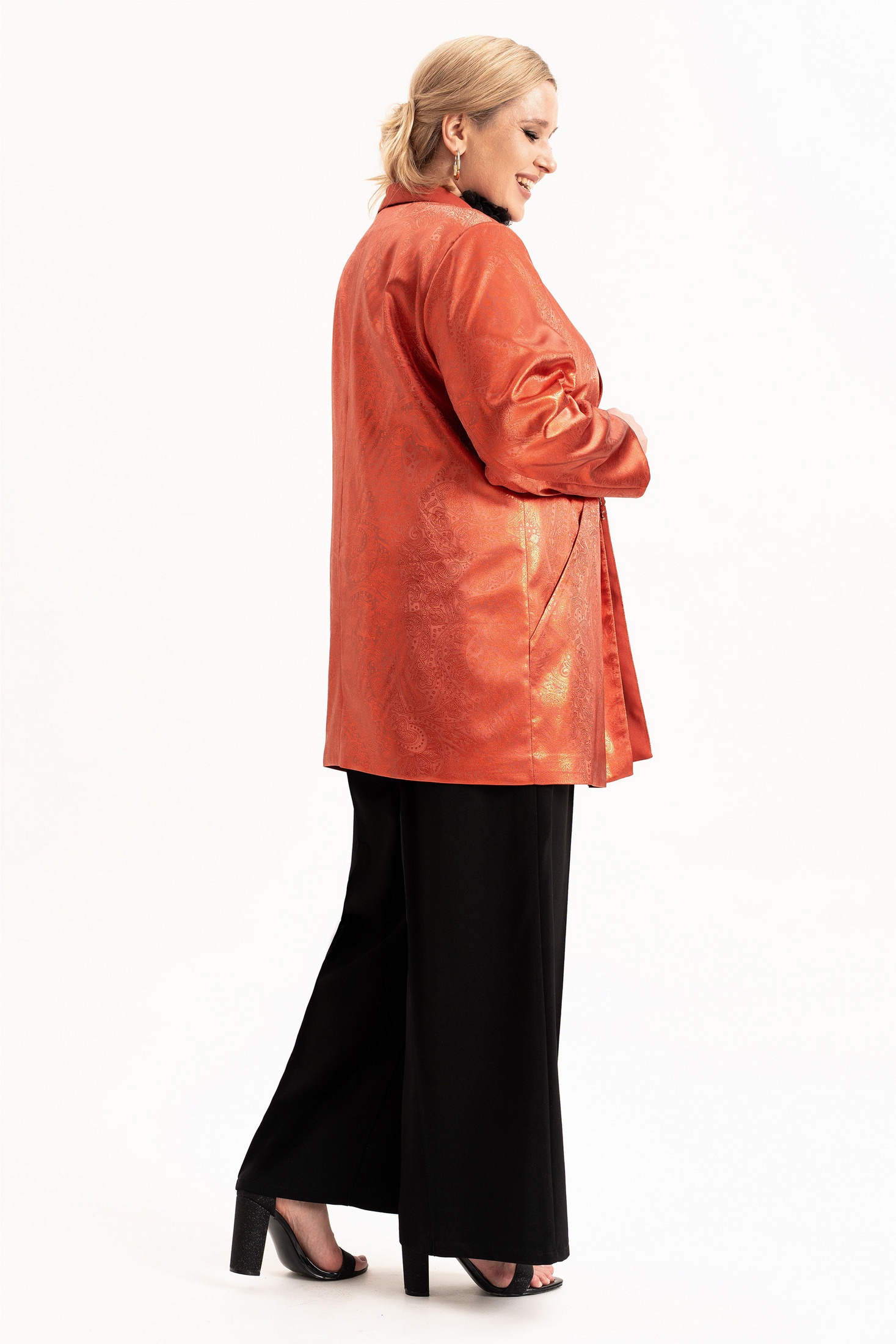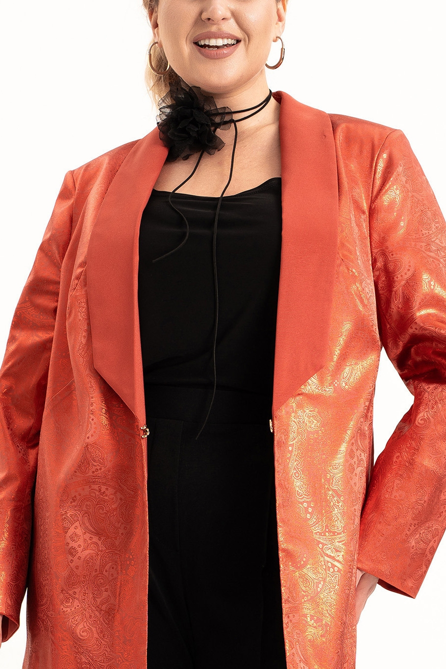 Этот женский нарядный жакет представлен в ярких тонах. Благодаря своему прямому, слегка приталенному силуэту, жакет обеспечивает максимальный комфорт и удобство при ношении. Вам не придется беспокоиться о чувстве стеснения или дискомфорта, так как он идеально подстраивается под вашу фигуру. Этот нарядный пиджак гарантированно привлечет внимание и подчеркнет вашу индивидуальность. Он доступен в больших размерах и подходит для женщин с разными типами фигуры. Вы сможете выглядеть модно и элегантно независимо от своего размера. На жакете обработан воротник шалька и карманы в фигурных рельефах. Жакет на подкладке с длинным рукавом. Застежка на декоративный крючок. Длина изделия (см): 80 Длина рукава (см):62
