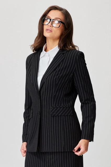 Жакет женский классический, выполнен из костюмной ткани в полоску. Перед с вытачками, бочками, с прорезными карманами с клапанами. Спинка со средним швом и бочками. Воротник пиджачного типа, рукава втачные двухшовные со шлицей. Жакет на подкладке.