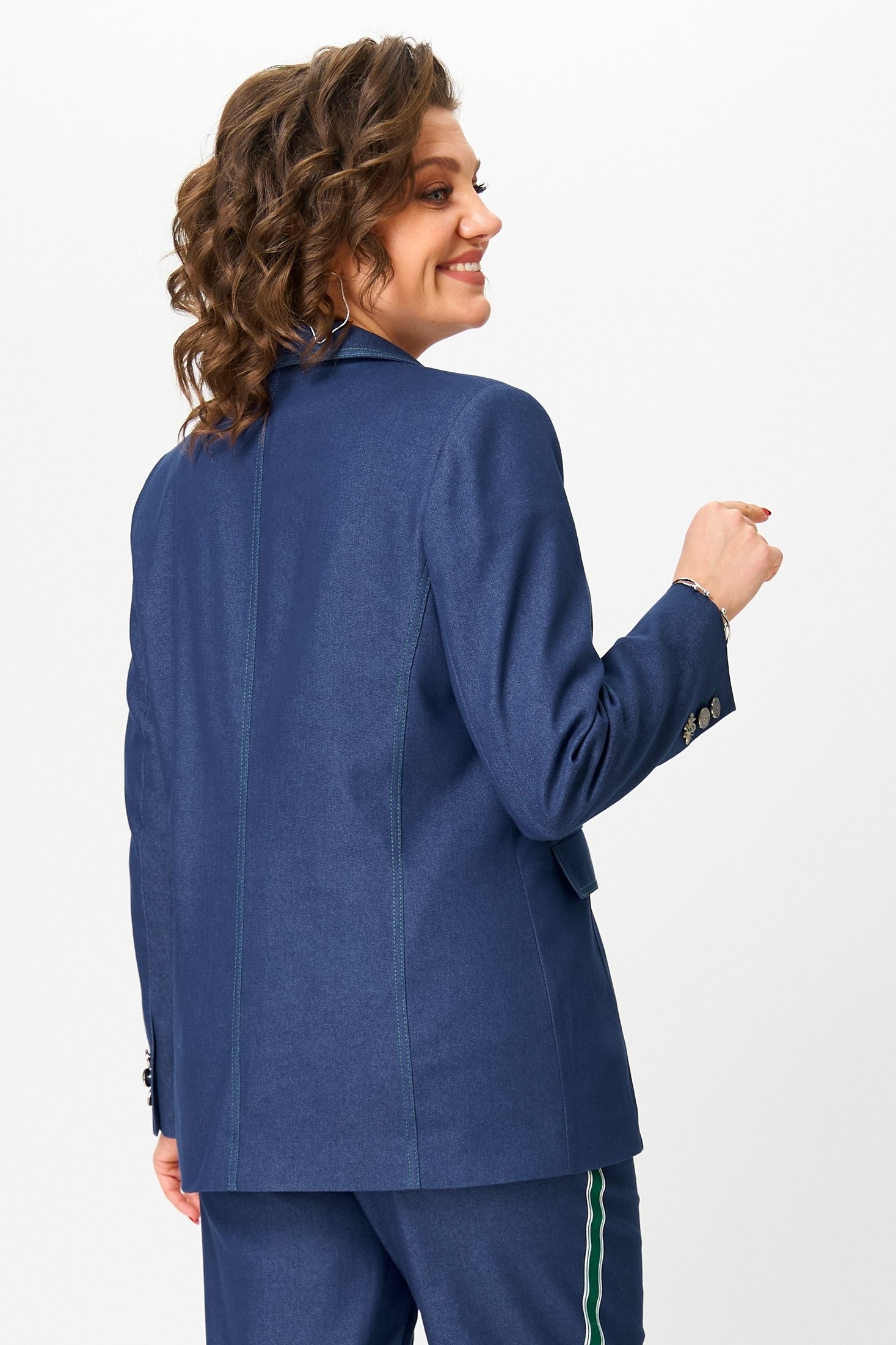 Жакет с застёжкой спереди на петли и пуговицы, с пиджачным воротником и втачными двухшовными рукавами со шлицами и акцентными пуговицами. По переду выполнены боковые карманы с клапанами и нагрудный накладной карман с съёмным дизайнерским украшением, спинка со швами.