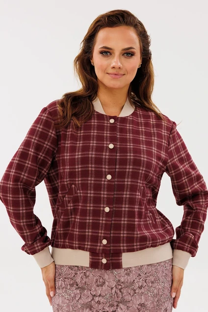 Жакет-бомбер женский в клетчатом принте, преимущественно в бордово-бежевых тонах, добавит нотку стиля вашему гардеробу. Модель выполнена в прямом силуэте с длиной 60 см и длиной рукава 61 см, что обеспечивает комфортное прилегание. Оснащен округлым воротником-стойкой и длинными рукавами с спущенной линией плеча, завершенными манжетами из трикотажного довяза, подчеркивающими расслабленный стиль. Центральная застежка на кнопки и наклонные прорезные карманы с листочкой спереди добавляют удобства, а также практичности. Манжеты по низу рукава и жакета также выполнены из трикотажного довяза, гармонирующего с общим дизайном. Этот бомбер идеально подойдет для создания как повседневных, так и более элегантных образов.