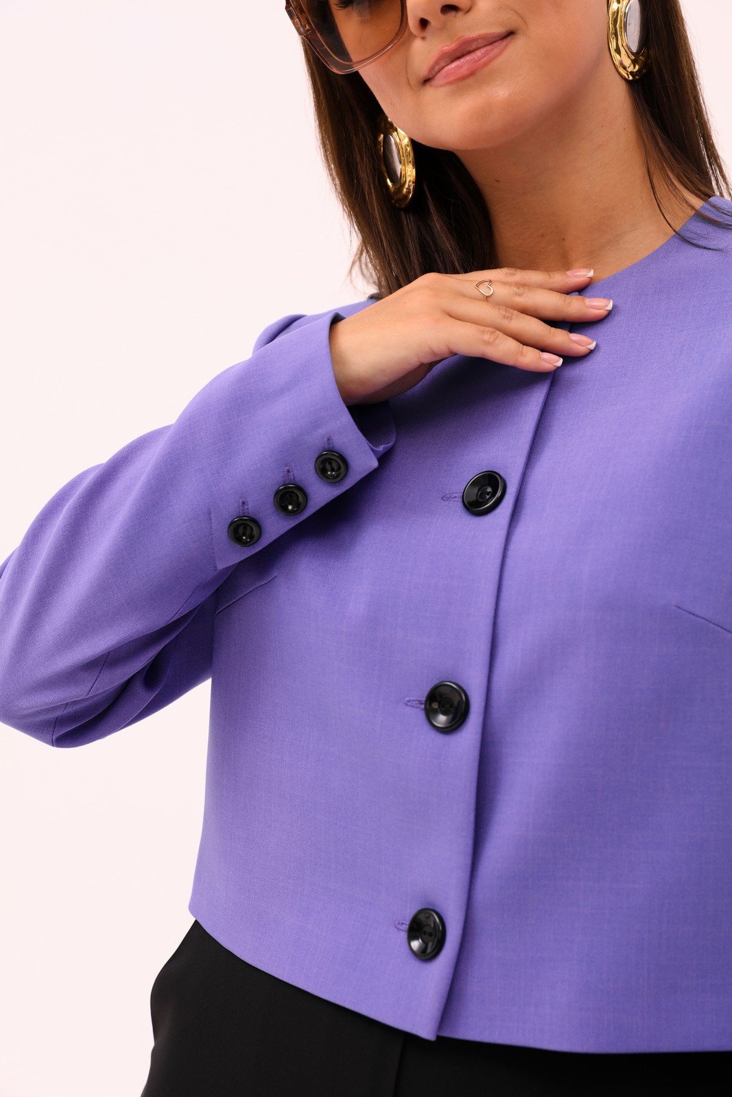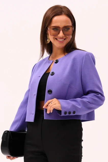 Лаконичный укороченный жакет из однотонной ткани - базовый элемент повседневного гардероба каждой женщины. Жакет идеален для создания делового образа, а также вечернего наряда.
