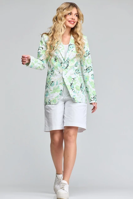 Классический однобортный жакет полуприталенного силуэта, без подкладки. Воротник пиджачного типа с отложными лацканами. По переду центральная застежка на петли и пуговицы, накладные карманы и рельефы. Низ бортов закругленной формы. Спинка со средним швом. Рукав втачной двухшовный длинный.