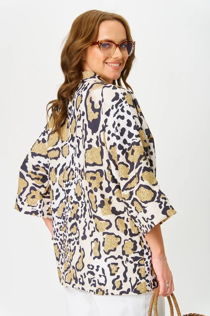 Жакет однобортный с воротником пиджачного типа и цельнокроеным рукавом 3/4 для повседневной носки и торжественных случаев. Жакет свободный , прямого силуэта с центральной застежкой на 3 петли и пуговицы . Длина изделия чуть ниже линии бедра .