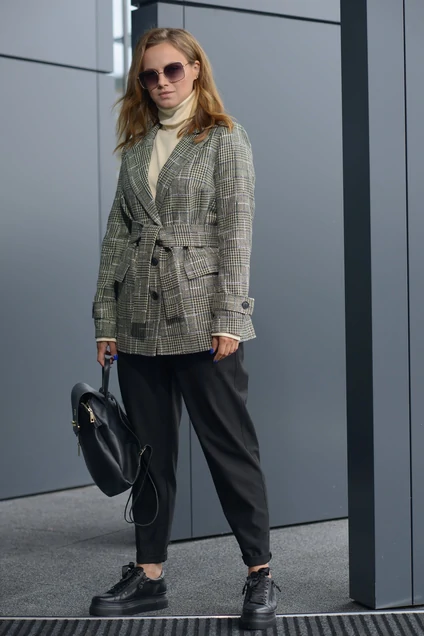 Жакет женский, повседневный, прямого силуэта с застёжкой на три обмётанные петли и пуговицы. Жакет со съёмным поясом. Перед с нагрудными вытачками, выходящими из бокового шва и прорезными карманами с листачками и клапанами. Спинка со шлицей в среднем шве. Рукава длинные, втачные двухшовные с патой в переднем шве, закреплённой на рукавах пуговицей. Воротник пиджачного типа с прямоугольными концами, концы воротника и лацкана разные по длине. Жакет на подкладке, притачной по низу.