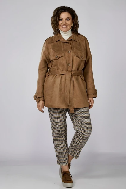 Жакет полуприлегающего силуэта, удлинённый, из смесовой ткани. Жакет с центральной застёжкой на планке на 5 петель и пуговиц. Покрой рукава - реглан. Детали переда с притачными планками. Перед с надстрочными фигурными клапанами, застегивающимися на одну петлю и пуговицу, и накладными карманами. Под клапаном обработана вытачка из проймы. Спинка со средним швом и отлетной кокеткой на подкладке. Рукав двухшовный с верхним и нижним швами. Рукав с декоративным погоном и пуговицей. Низ рукава декорирован хлястиком, застегивающимся на одну петлю и пуговицу, и шлевками. Воротник с отрезной стойкой. В боковом шве обработаны карманы и настрочены шлевки для пояса. Жакет на частичной подкладке.