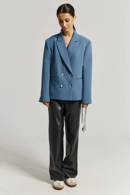 Жакет красивого синего цвета. Жакет двубортный, на подкладке, выполнен из качественной костюмной ткани. По переду изделия выточки, по бокам прорезные функциональные карманы. Рукав втачной, по низу рукава небольшая пуговица