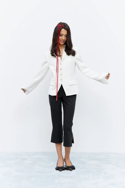 Жакет приталенного силуэта, в белом цвете. По переду карманы с клапанами, жакет декорирован функциональными пуговицами по переду изделия.