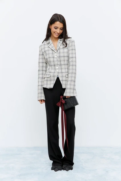 Жакет приталенного силуэта, из светлой твидовой ткани. По переду карманы с клапанами, жакет декорирован функциональными пуговицами по переду изделия.