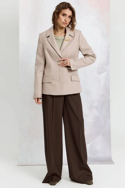 Жакет приталенного силуэта, в бежевом цвете из костюмной ткани с добавлением шерсти. По переду застежка на потайные пуговицы. По бокам карманы с клапанами. По низу рукава небольшой разрез по шву. Жакет на подкладке в цвете хамелион. Длина по спинке 65 , длина рукава 63.