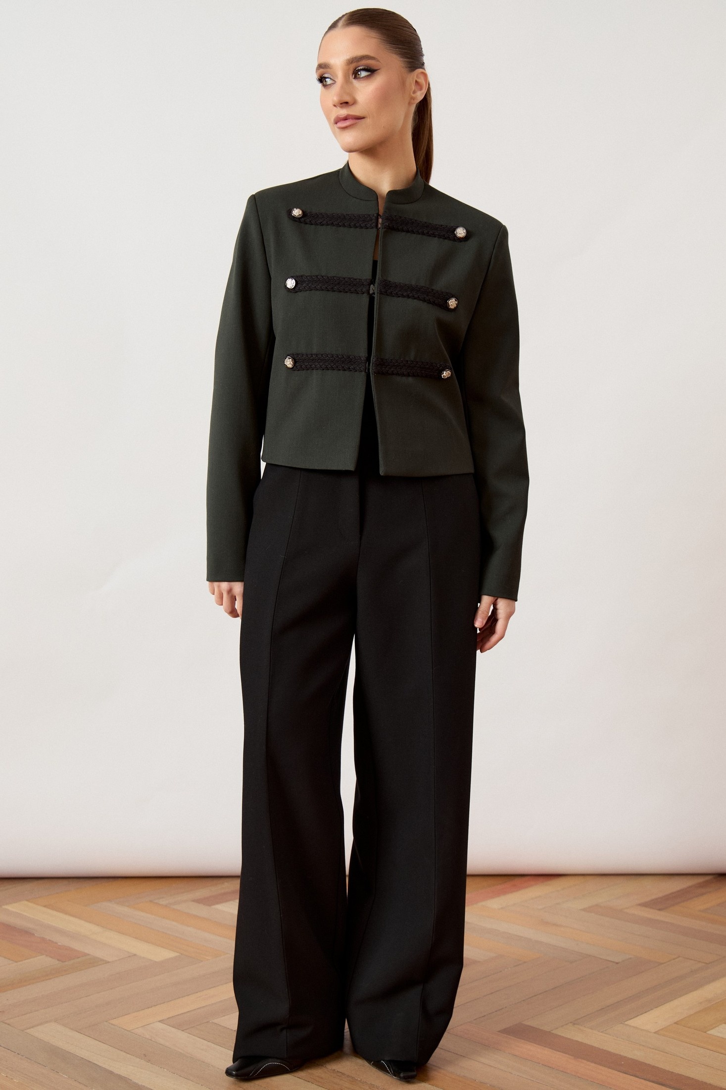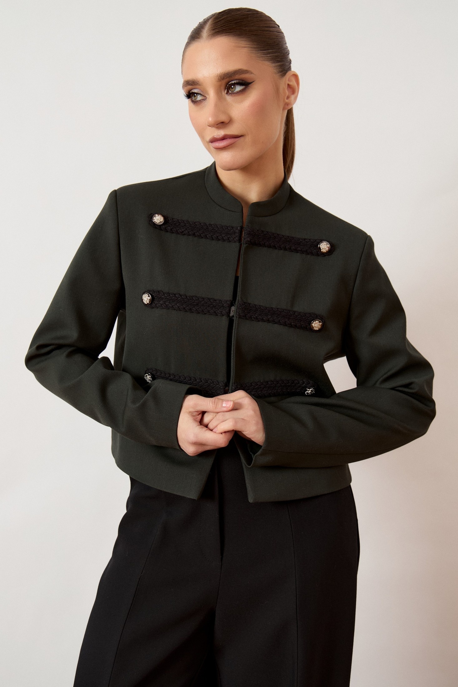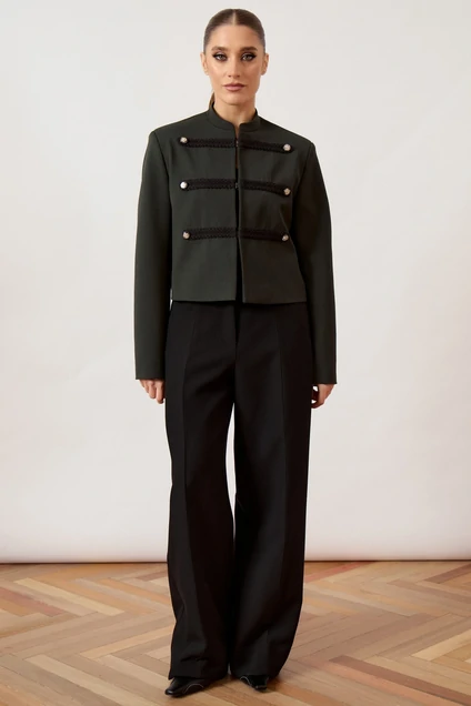 Жакет женский, укороченный, прямого силуэта, из плотной костюмной ткани в стиле милитари. Модель с воротником-стойкой и центральной бортовой застежкой (стык в стык) на потайные крючки или кнопки. Перед оформлен шестью декоративными горизонтальными патами из плетеного шнура, каждая из которых дополнена металлической пуговицей. Рукав втачной, двухшовный, классической длины. Изделие на притачной подкладке, плечевой пояс подчеркнут плечевыми накладками.