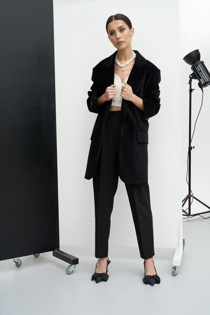 Жакет прямого свободного кроя выполнен из бархатной ткани на хлопковой основе в чёрном цвете