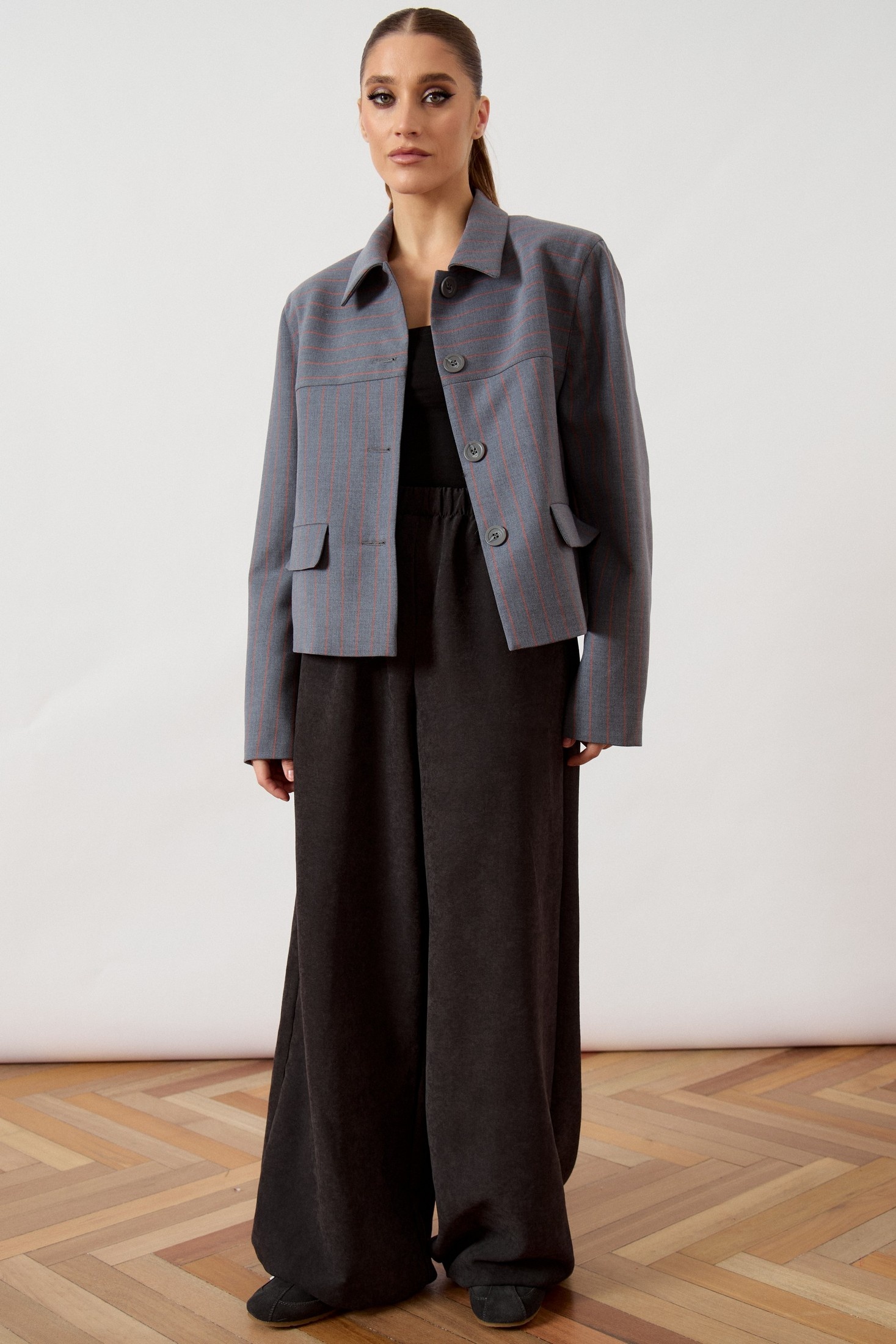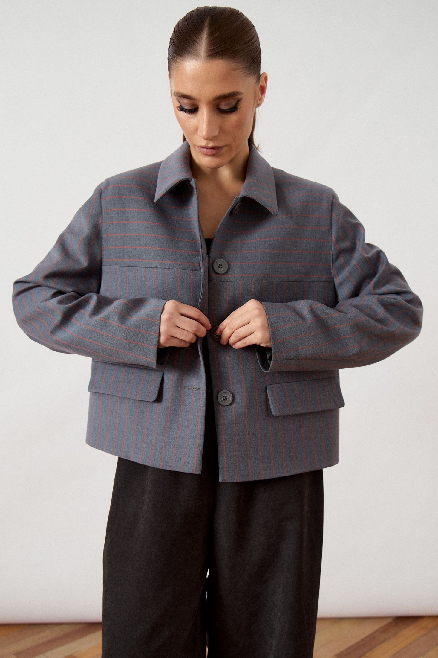Жакет укороченный, прямого силуэта с отложным воротником и центральной бортовой застежкой на три петли и пуговицы. Полочка с горизонтальным подрезом выше линии груди и прорезными карманами с клапанами. Спинка с горизонтальной кокеткой. Рукав длинный, втачной, двухшовный.