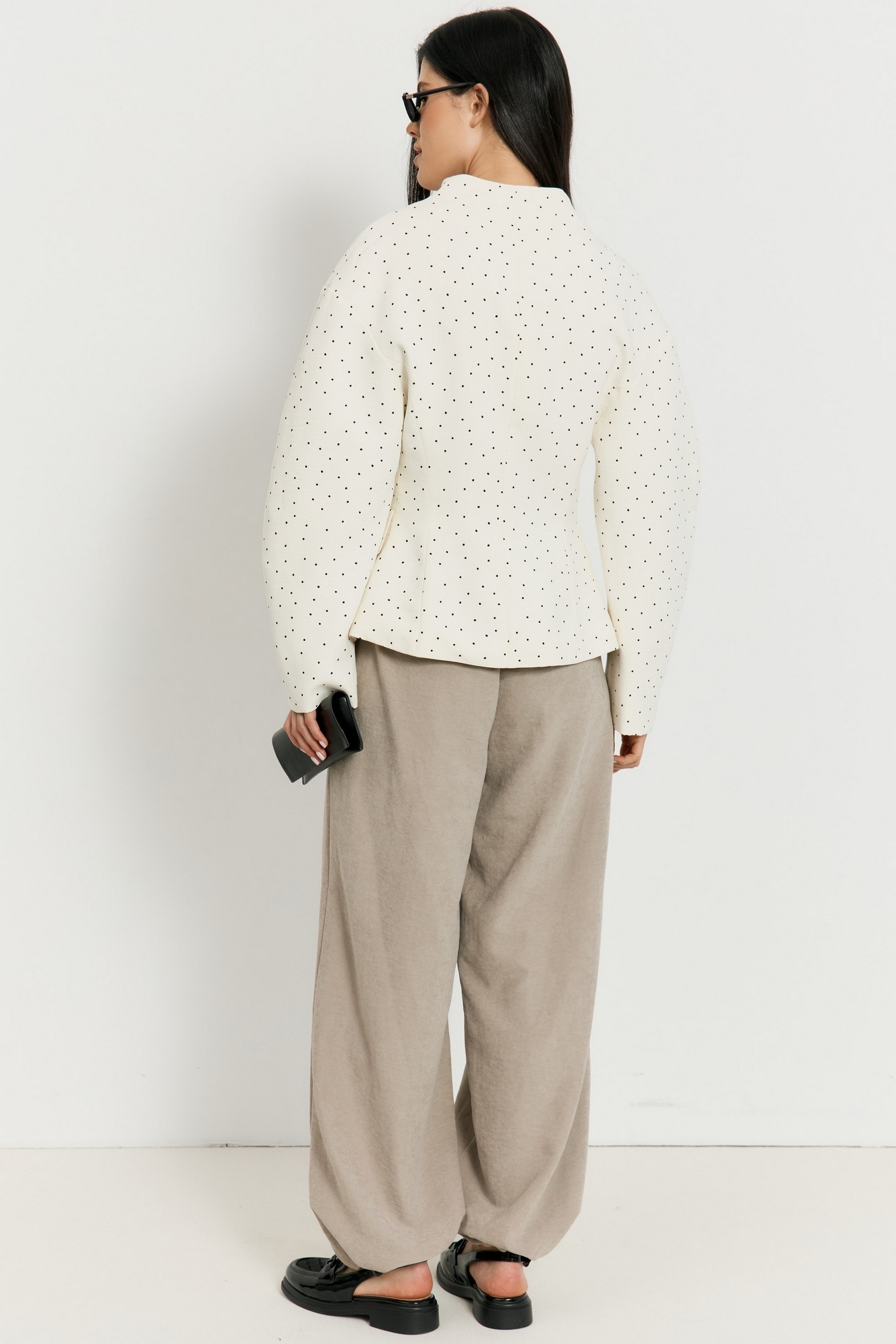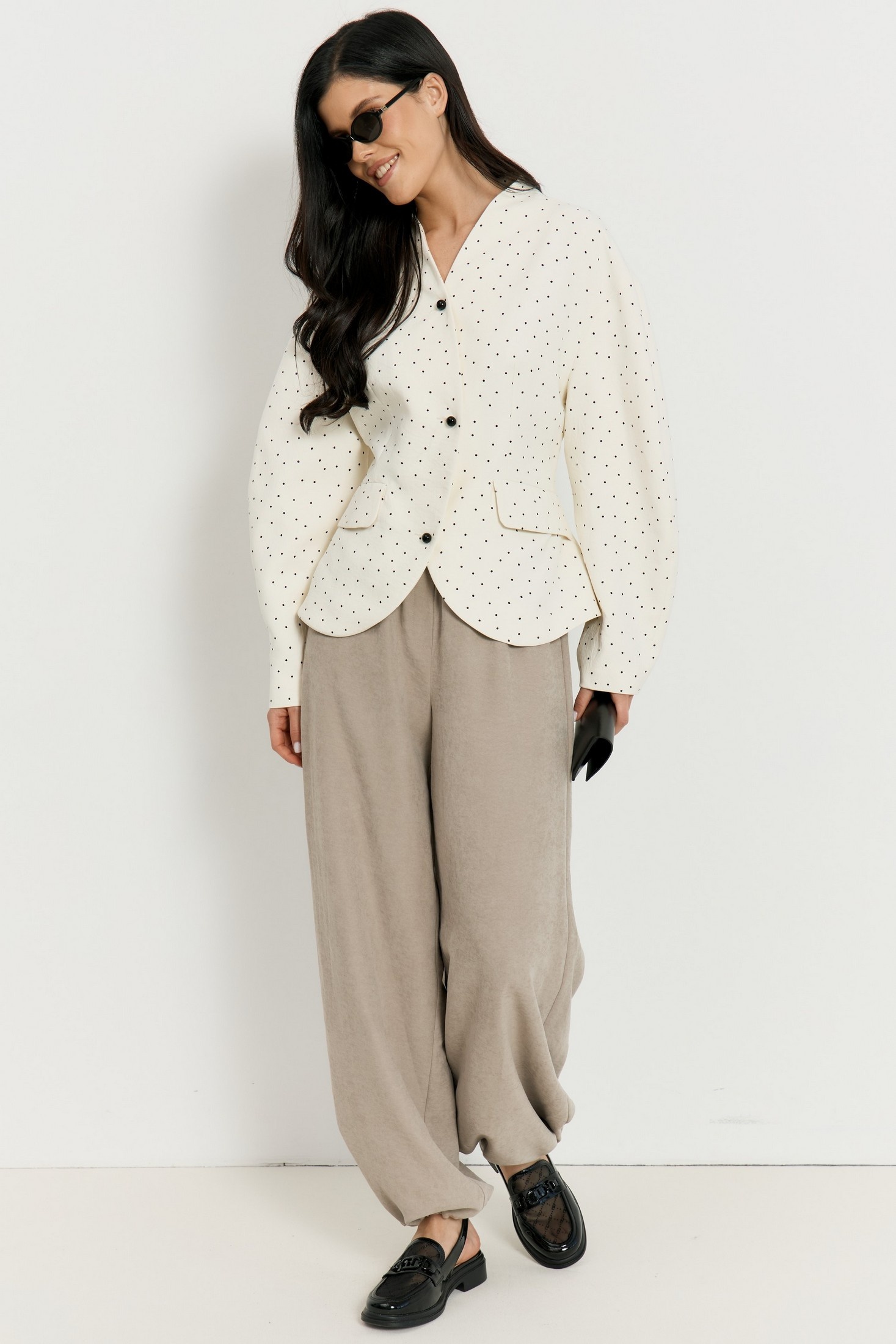 Жакет 3530 ATTIKA воплощает стиль и современность в коллекции бренда ATTIKA. Этот приталенный жакет из плотной вискозной ткани с легким полиэстером имеет принт в мелкий горошек, что добавляет изящности и индивидуальности. Архитектурный крой с объемными рукавами «баллон» и спущенной линией плеча создает женственный силуэт, подчеркиваемый V-образным вырезом и центральной застежкой на контрастные пуговицы. Прорезные карманы с клапанами делают жакет удобным и функциональным вариантом для офиса или повседневной жизни. Белый цвет и универсальный стиль позволяют сочетать его с различными элементами гардероба, придавая образу свежесть и утонченность. Идеальный выбор для сезона весна-осень.