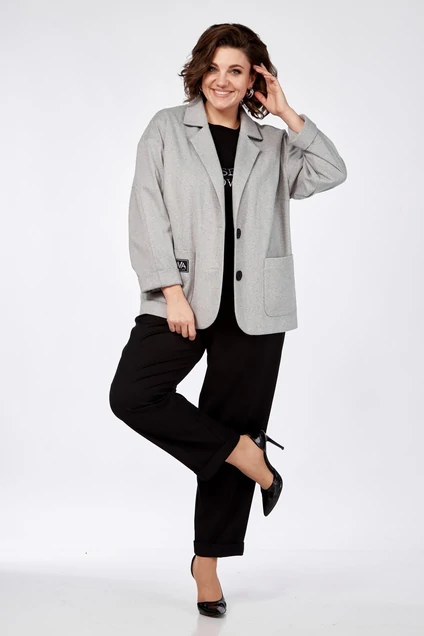 Трикотажный женский жакет на пуговицах прямого кроя. Рукава длинные свободные на манжете, со спущенным плечом. По полочке накладные карманы. В среднем шве спинки-щлица. Длина жакета - 68 см.