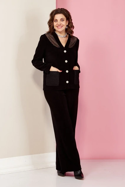 Женский жакет из трикотажа-вельвет подходит, как для вечернего мероприятия так и для повседневной прогулки. Жакет без подкладки. Горловина V-образной формы. Центральная застежка на стильные декоративные пуговицы. Рукав втачной длинный. На передних деталях кокетка с сетки и накладные карманы. Карманы не только элемент отделки,но и они полностью функциольные. Стильный классический, слегка укороченный жакет прекрасно дополнит гардероб любой женщины. Длина-60 см.