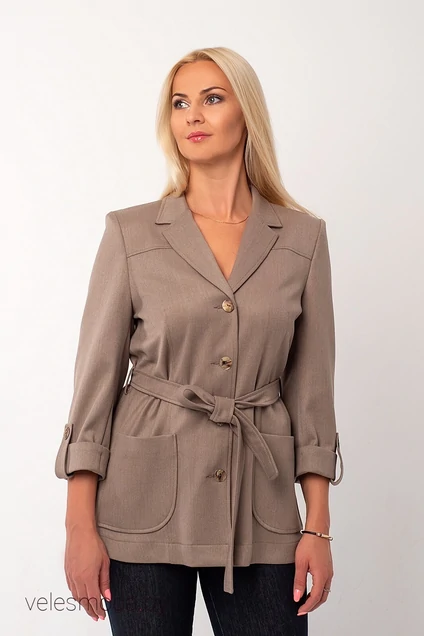 Жакет с поясом и рукавами 3\4. Жакет застегивается на пуговицы, спереди два накладных кармана. На рукавах подвороты.
