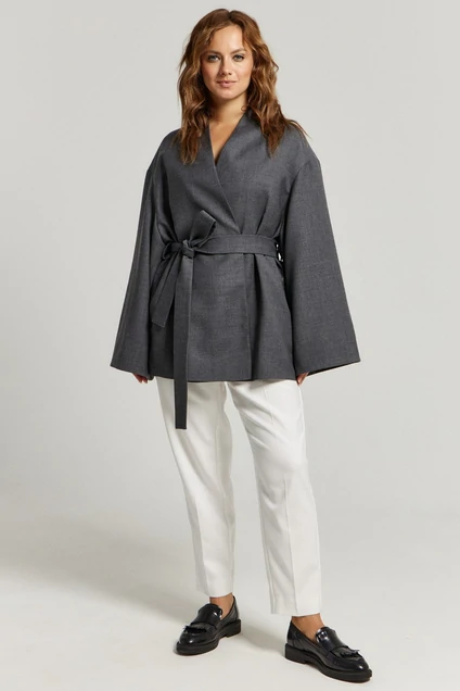 Темно-серый жакет из костюмной ткани. Жакет свободного кроя, съемный пояс по талии изделия, рукав спущенный, расширенный к низу. Жакет на подкладке.