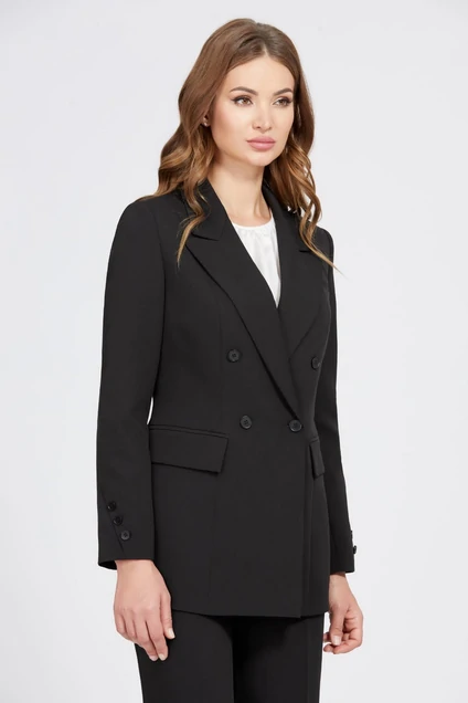 Двубортный жакет полуприлегающего силуэта с застежкой на петли и пуговицы, выполнен из приятной ткани с добавлением вискозы. Небольшой процент эластана в составе обеспечивает комфортную посадку. Модель дополнена отложным воротником с графичными лацканами , функциональными карманами с рамками и клапанами, декоративным карманам с рамками и оригинальными шлицами по низу втачных рукавов с пуговицами. На подкладке. Модель прекрасно комбинируется с брюками .