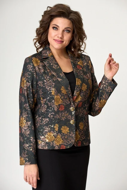 Жакет женский укороченный, полуприлегающего силуэта с центральной бортовой застежкой на пуговицы до линии перегиба лацкана. Спереди рельефные швы от плечевого шва, отрезной бочок и накладной карман. Спинка со средним швом и рельефами от плечевого шва. Рукав втачной, двухшовный. Воротник пиджачного типа. Жакет на подкладке. Длина рукава 62 см, длина по спинке 59 см.