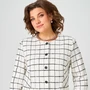 Жакет женский удлиненный, из текстильной ткани, полуприлегающего силуэта с центральной бортовой застежкой на пуговицы до линии перегиба лацкана. По переду имеется отрезной бочок и вертикальные вытачки. С прорезными карманами с клапаном и двумя обтачками. Спинка цельная. Воротник пиджачного типа. Рукав двухшовный, втачной. Жакет на подкладке. Длина рукава 63 см, длина по спинке 75 см.