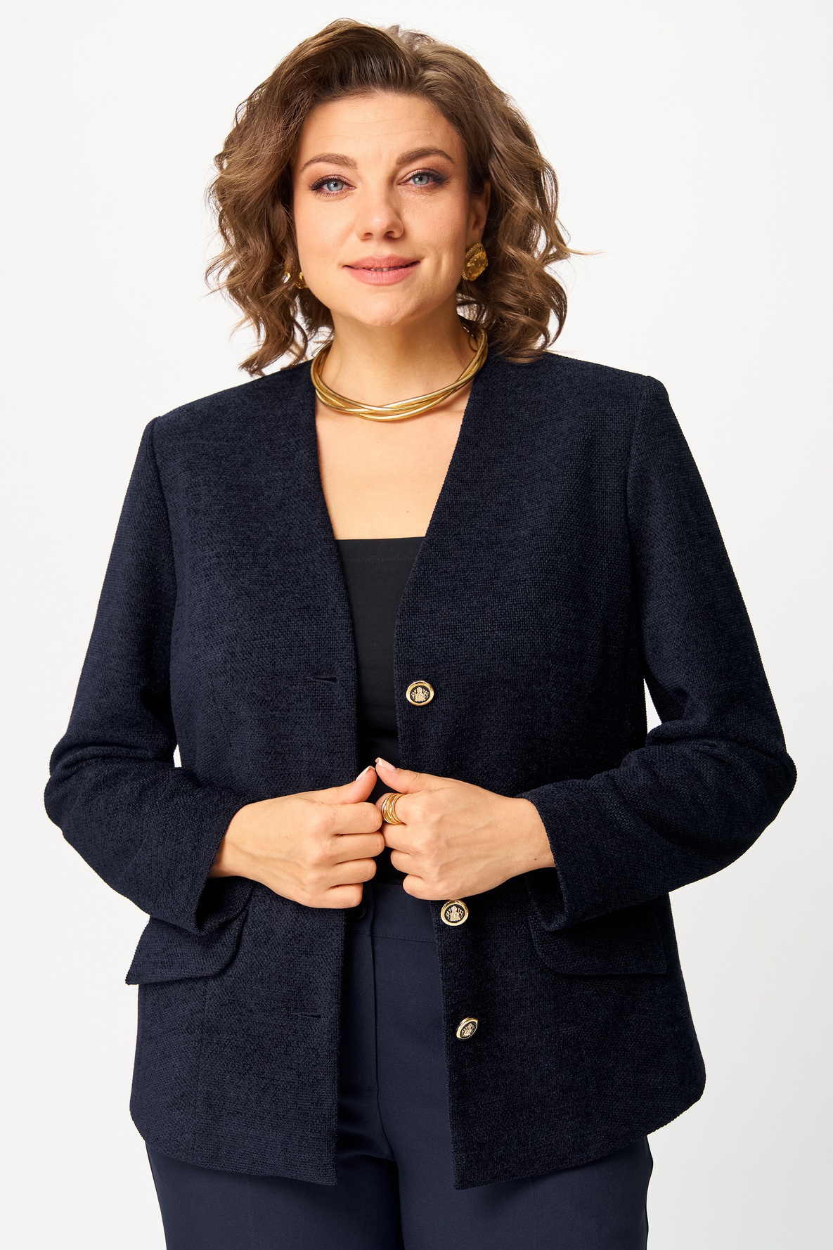 Базовый жакет классического кроя, из премиального трикотажа, с центральной застежкой и V-образным вырезом, стройнит фигуру, зрительно вытягивает шею и создает элегантный силуэт, карманы функциональные с клапаном. Рукав полноценной длины. Длина жакета по спинке 62 см