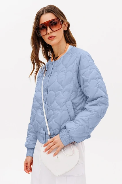 Бомбер прямого силуэта со спущенным плечом и втачным рукавом и с центральной застежкой на кнопки. По переду карманы-листочки. По низу рукавов и низу бомбера приточная планка на резинке. По горловине декоративная отделка из довяза. Бомбер на подкладке.