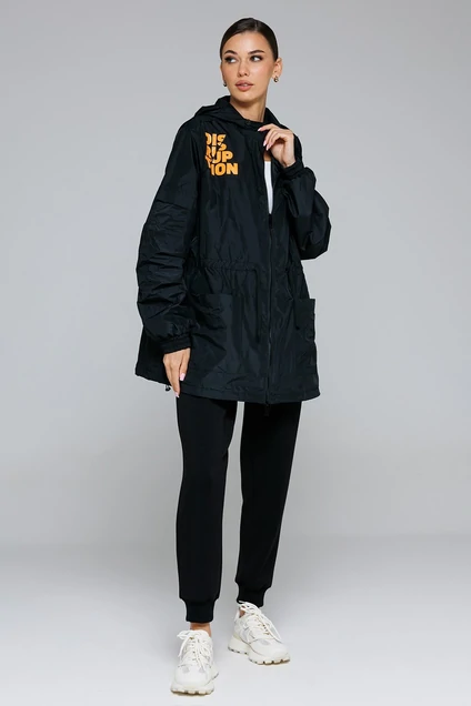 Жакет спортивный летний,удлиненный. Жакет прямого силуэта, с втачным двух шовным рукавом, и 2 -мя горизонтальными складками, на одном из рукавов накладной карман с клапаном, внизу рукав на притачной отстроченной манжете на резинке. Полочка с застежкой на тракторную тесьму-молнию, с кокеткой с печатью и накладным карманом. Спинка с кокеткой. По переду и спинки кулиса со шнурком. По низу парки вставлена эластичная тесьма с фиксаторами. Парка с капюшоном цельнокроеным со стойкой и вставленной в него эластичной тесьмой с фиксаторами. Полочка и спинка на трикотажной подкладке (сетка).