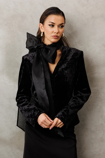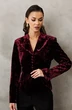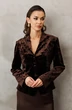 Жакет из велюровой ткани полуприлегающего силуэта, с втачным двухшовным рукавом. Полочка и спинка с отрезной баской по линии талии. Полочка с V-образным вырезом, однобортной застежкой на петли пуговицы и талиевой вытачкой от баски. Спинка с центральным швом. Жакет с отрезным бочком, переходящим на полочку и на спинку. Жакет на подкладке.
