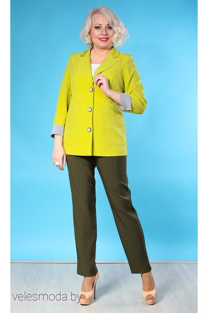 Летний жакет без подкладки насыщенного грушевого цвета создаст хорошее настроение. Контрастные вставки на манжетах из ткани в мелкую сине-белую полоску обрамляют втачные рукава длиной 7/8. Акценты добавлены тремя круглыми пуговицами и отложным воротником с лацканами.
