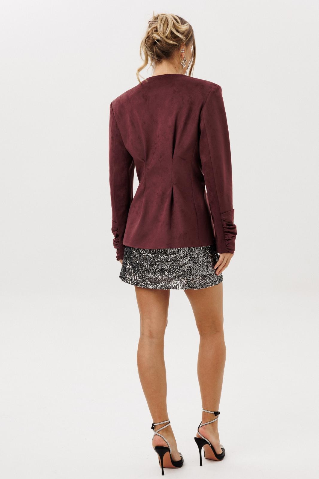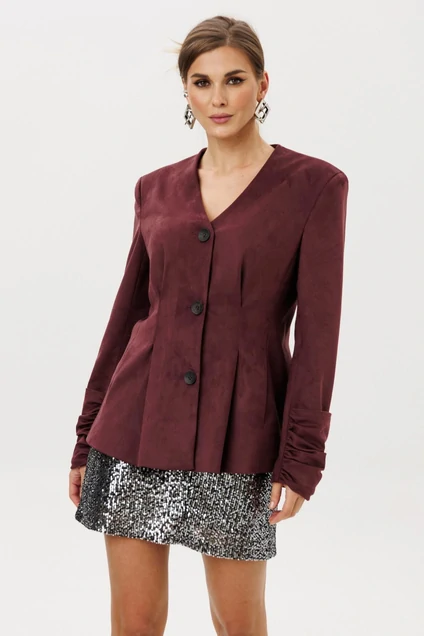 Жакет прилегающего силуэта с центральной бортовой застежкой на 3 прорезных петли и пуговицы. Жакет выполнен из искусственной замши. Перед со складкой застроченной на уровне талии, с бочком. В шве притачивания бочка обработан карман “ в швах”. Спинка со складками ,застроченными на уровне линии талии. Рукава втачные двухшовные длинные с накладной деталью со сборкой внизу верхней части рукава. Вырез горловины V-образный. Жакет на подкладке и с плечевыми накладками.