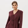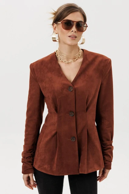 Жакет прилегающего силуэта с центральной бортовой застежкой на 3 прорезных петли и пуговицы. Жакет выполнен из искусственной замши. Перед со складкой застроченной на уровне талии, с бочком. В шве притачивания бочка обработан карман “ в швах”. Спинка со складками ,застроченными на уровне линии талии. Рукава втачные двухшовные длинные с накладной деталью со сборкой внизу верхней части рукава. Вырез горловины V-образный. Жакет на подкладке и с плечевыми накладками.