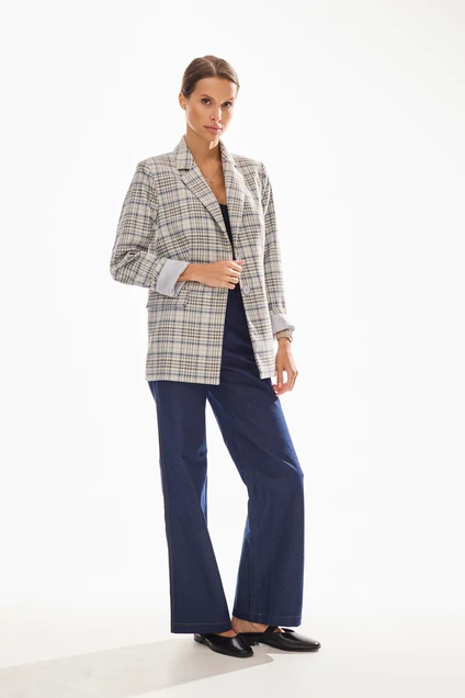 Жакет женский полуприлегающего силуэта , выполненный из костюмной ткани высокого качества . Жакет с центральной застежкой , рукав втачной двухшовный , внизу рукава шлица. Воротник стояче - отложной с отворотами лацканов . По переду жакета также функциональные карманы с клапанами . Жакет на подкладке.