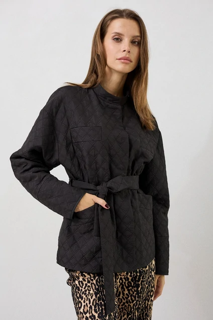 Жакет женский утепленный , полуприлегающего силуэта , выполненный из фактурной двухслойной ткани . Жакет с центральной застежкой на пришивных кнопках . Рукав спущенный одношовный. Воротник в виде невысокой стойки . По переду жакета подкладка , а также функциональные карманы. В комплекте также пояс из основной ткани .