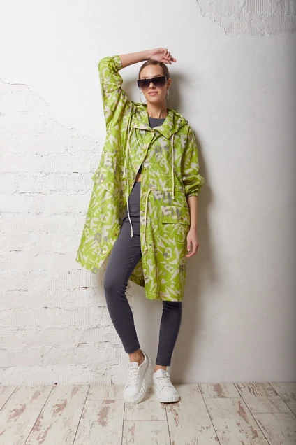 Жакет из тонкой плащёвой ткани, прямого силуэта, свободного кроя «оверсайз». На уровне талии подрез с кулисой и втянутым шнуром. Плечевой шов спущен, рукава длиной до запястья с эластичной тесьмой по низу. Жакет с капюшоном, переходящим в воротник-стойку. Капюшон из трёх деталей с застроченной кулисой по переднему краю, и втянутым шнуром. На уровне бёдер, на передних половинках, накладные прямоугольные карманы с клапанами, вход в карман со стороны бокового шва, клапан, по центру, закреплён пробивной кнопкой. Спинка без особенностей. Застёжка центральная, от верхнего края воротника до низа, на пробивные кнопки на притачной планке. По клапанам и карманам прострочена двойная отделочная строчка. По капюшону, плечевым швам, по проймам частично, прострочена отделочная строчка. Линия низа прямая, застрочена широкой отделочной строчкой. Жакет без подкладки.