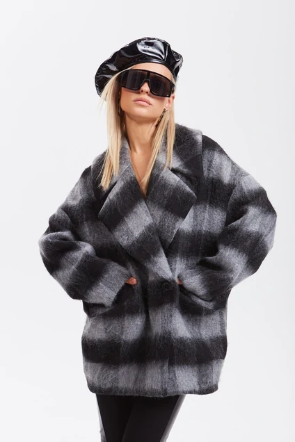 Жакет из мягкой пальтовой ткани с ворсом, с дизайном крупная клетка, свободного кроя «оверсаиз», силуэта «бочонок» длиной чуть ниже линии бёдер, со спущенной линией плеча. Рукава длиной до запястья с локтевыми вытачками. Воротник и лацканы пиджачного типа, расширены по отлёту, концы воротника и лацканов вытянуты. Детали переда с наклонными карманами с широкой листочкой, расположенными под наклоном ниже линии талии. Спинка без особенностей. Застёжка центральная двубортная на две петли и пуговицы. Жакет на подкладке.