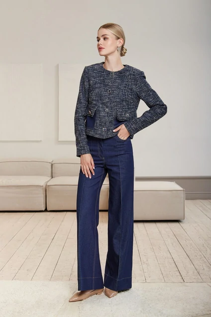 Жакет из плотной костюмной ткани «рогожка» укороченный, длиной ниже талии, прямого силуэта, с двухшовными рукавами длиной до запястья, горловина округлой формы, без воротника. Детали переда с нагрудными вытачками, с настрочными карманами из отделочной ткани и клапанами со скруглёнными концами и бахромой, расположенными на уровне линии талии. Спинка со средним швом. Застёжка жакета однобортная на петли и пуговицы. Жакет на подкладке.