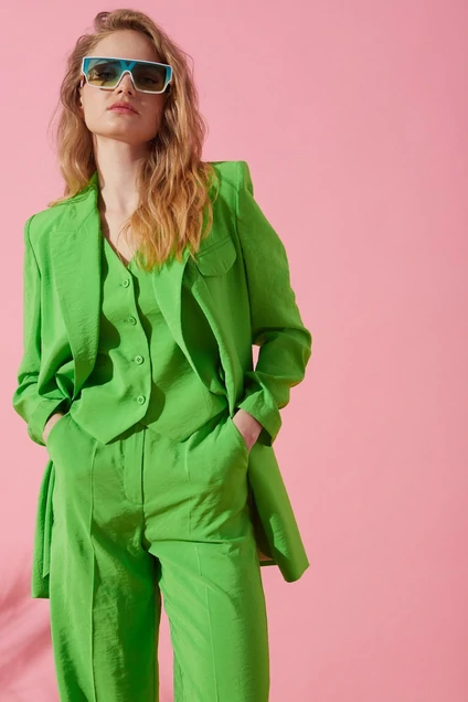 Жакет из вискозной ткани, прямого силуэта, длиной ниже линии бёдер с втачными двухшовными рукавами, воротником пиджачного типа, с двубортной застёжкой на четыре петли и пуговицы. Детали переда с рельефами от проймы до низа, смещёнными в сторону боковых швов, с прорезными функциональными карманами «в рамку» ниже линии талии, слева, выше линии груди с прорезным нефункциональным карманом «в рамку» и фигурным клапаном. Спинка с рельефами из пройм до низа и шлицей в среднем шве. Рукава длиной до запястья. Концы лацканов острые и вытянуты относительно концов воротника, концы воротника – прямоугольные. Начало застёжки на уровне талии. Нижние края бортов скруглённые. Жакет на частичной подкладке, перед закрыт от плечевого шва до низа, спинка частично, в виде отлетной кокетки.