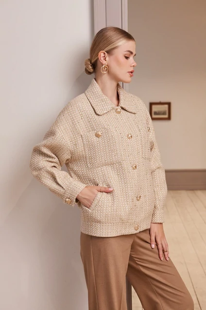 Жакет из мягкой костюмной ткани «рогожка» с люрексовой нитью, длиной до линии бёдер, силуэта «бочонок», свободного кроя, со спущенной линией плеча, горловина округлой формы, воротник стояче отложной со скруглёнными концами, расширен по отлету. Рукава длиной до запястья с двумя парами складок по швам притачивания манжет. Детали переда с настрочными прямоугольными карманами на уровне груди, нижние углы карманов скруглённые. Ниже талии расположены наклонные карманы с листочкой. Спинка без особенностей. Застёжка жакета центральная на петли и пуговицы. Манжеты с застёжкой на петлю и пуговицу. Низ жакета присобран притачным поясом. Жакет на подкладке.