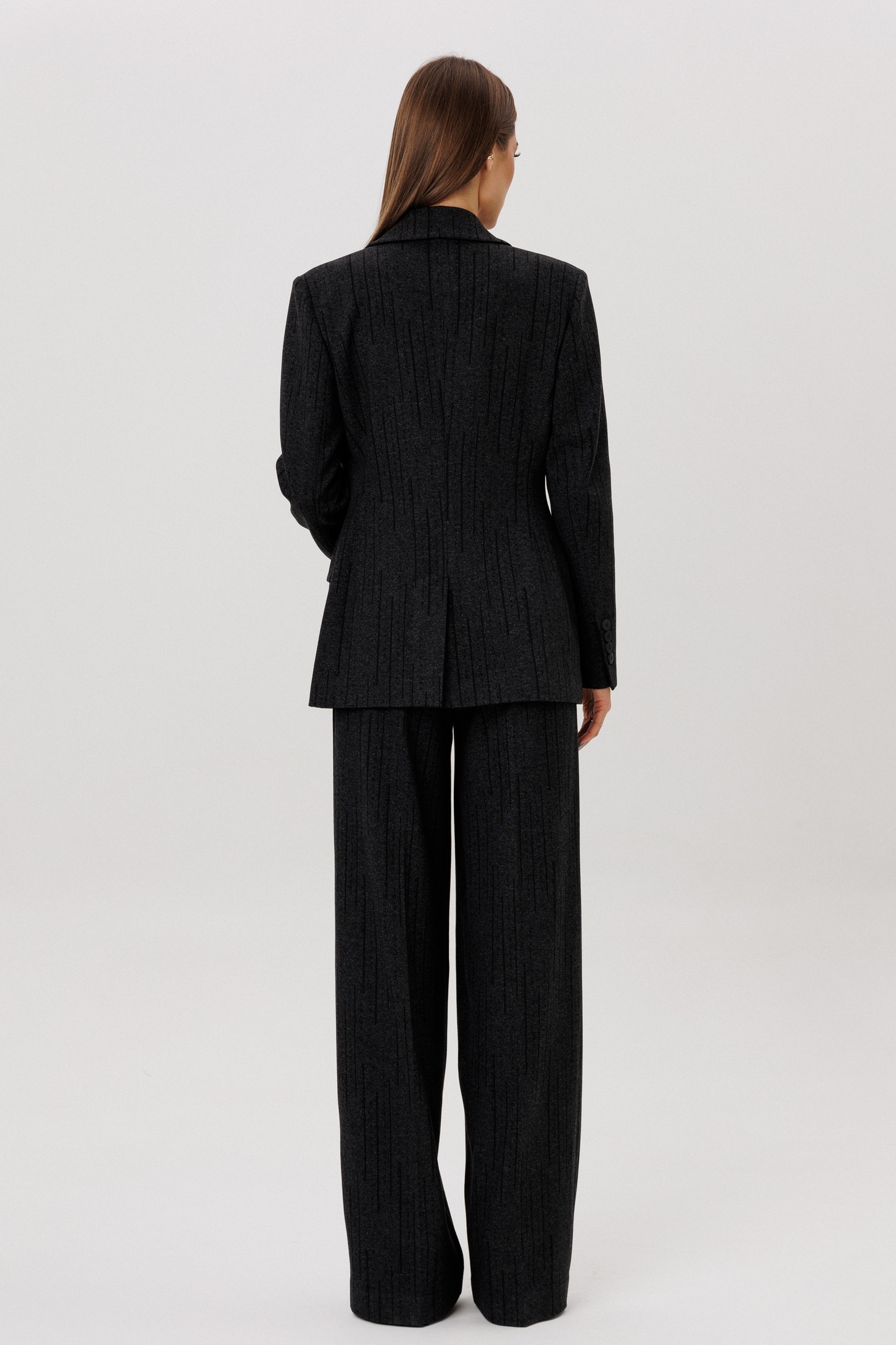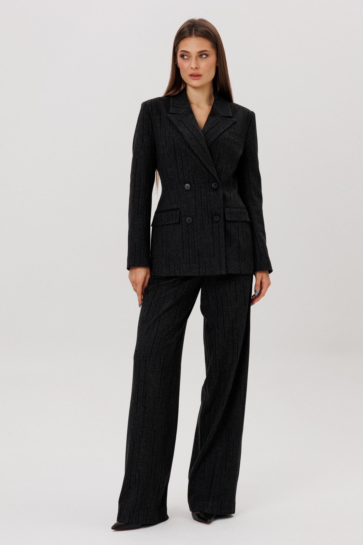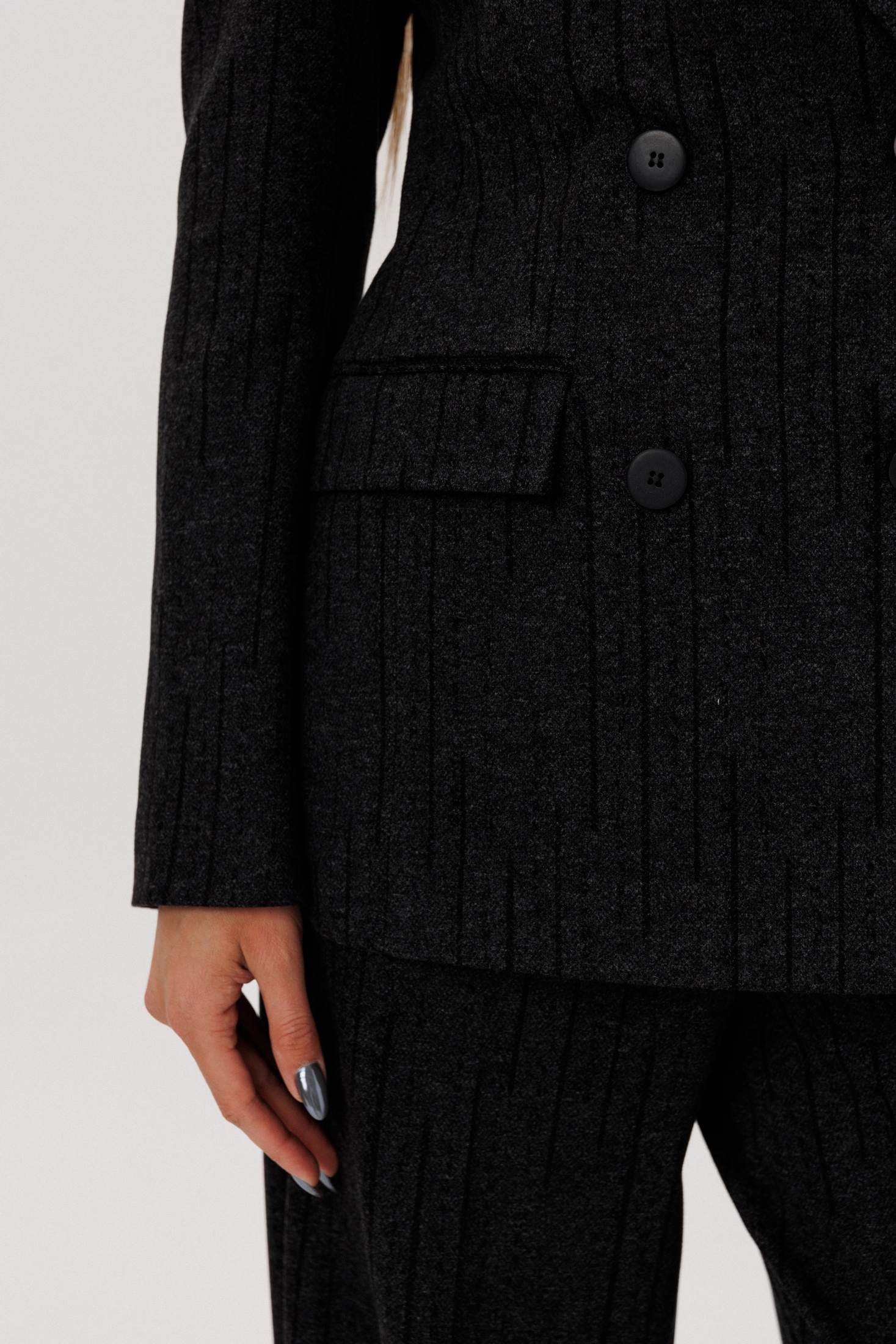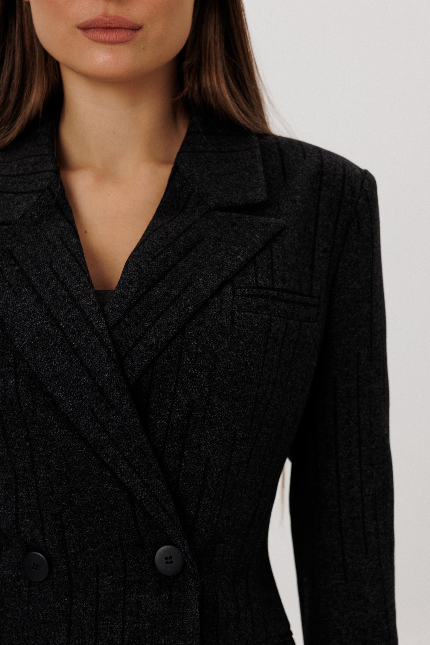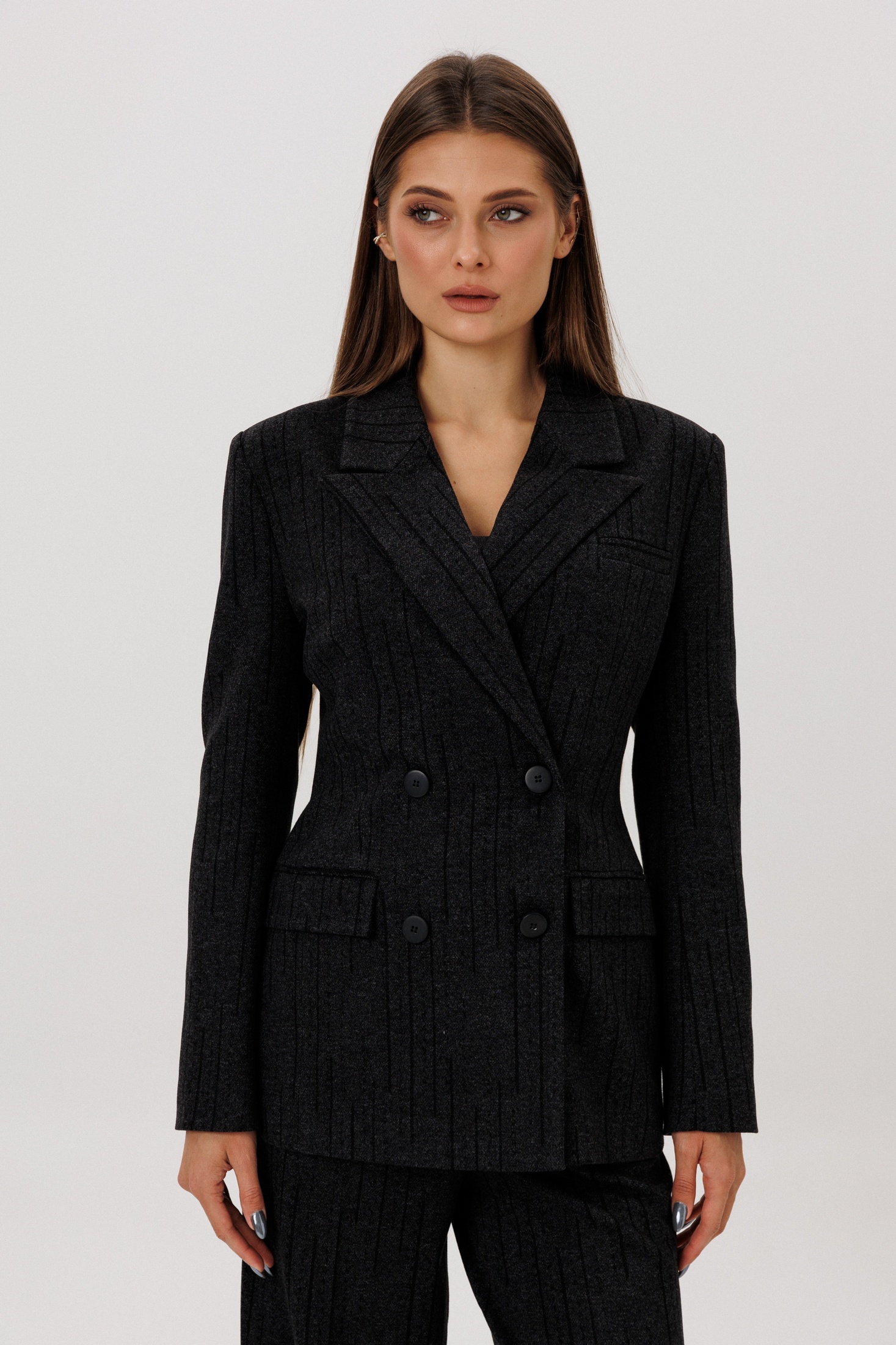 Этот элегантный двубортный жакет сделан в полуприлегающем силуэте, подчеркивающем женственные очертания. Жакет выполнен в темно-сером оттенке с тонким вертикальным рисунком, создающим легкую текстуру на ткани. Детали дизайна включают классический лацкан и функциональные карманы, добавляющие практичности и стиля. Длина жакета по спинке составляет 75 см, а длина рукава — 61 см, обеспечивая идеальное соответствие размерам. Этот жакет отличается безупречным кроем и качеством, делая его идеальным выбором для бизнес-встреч и официальных мероприятий.