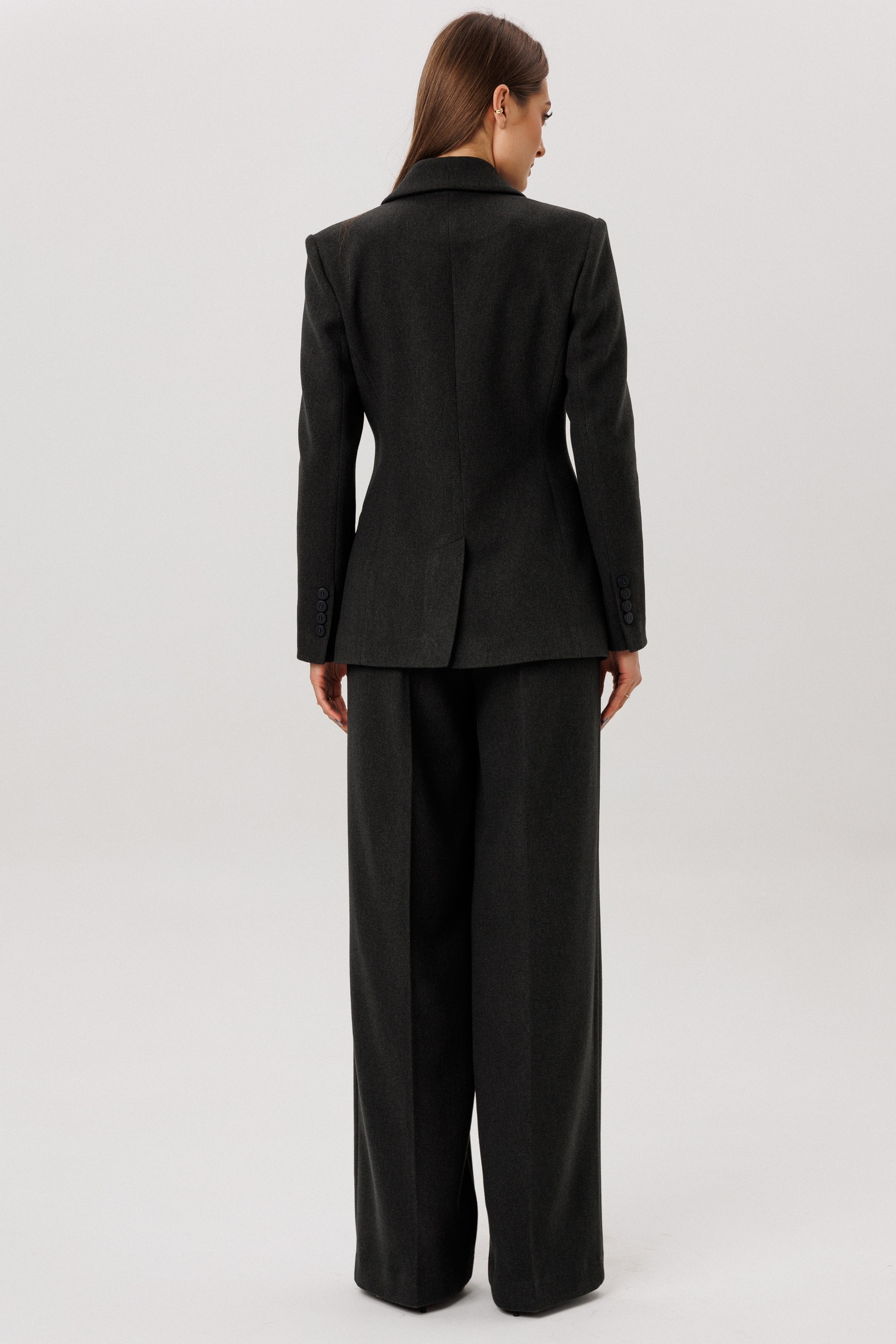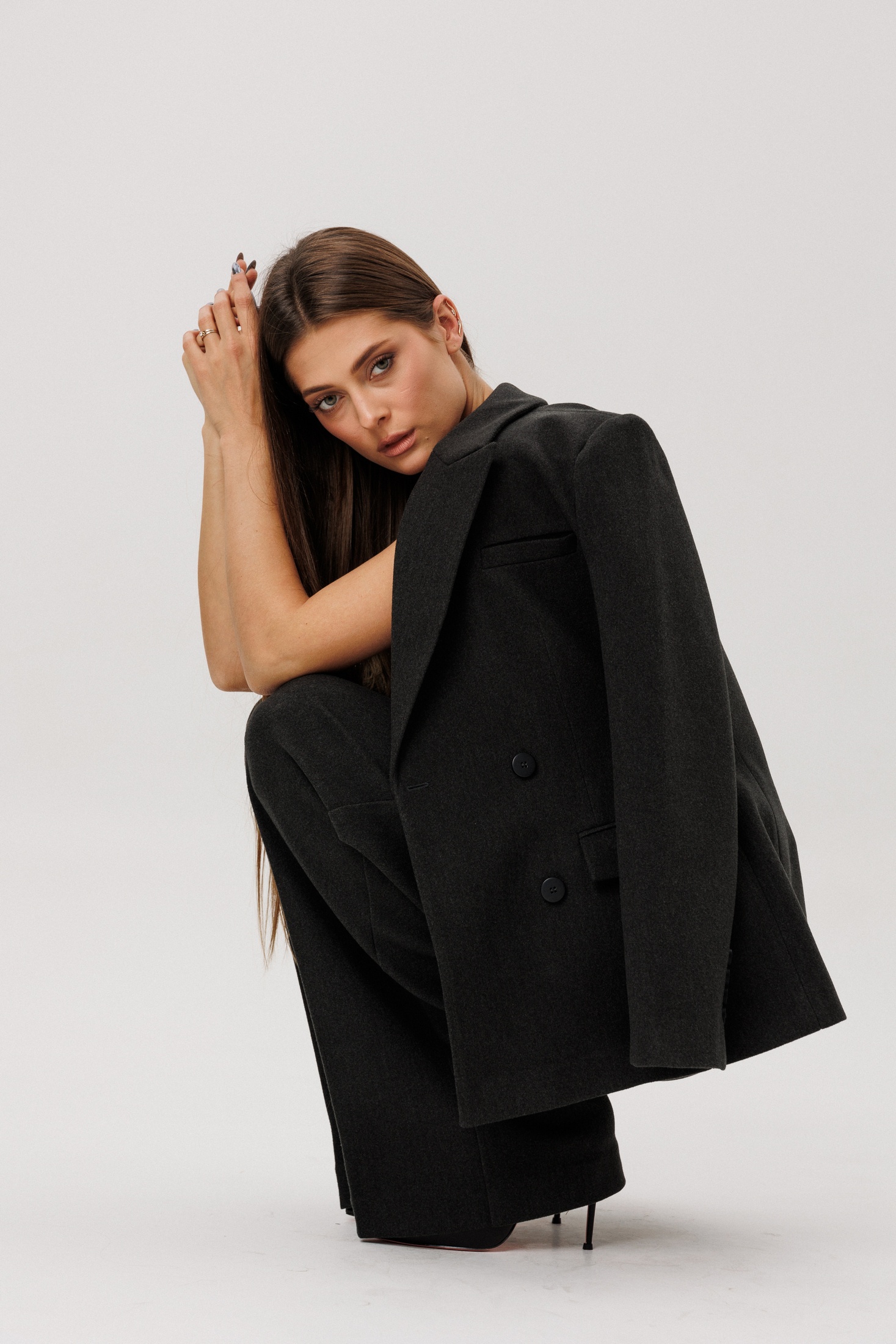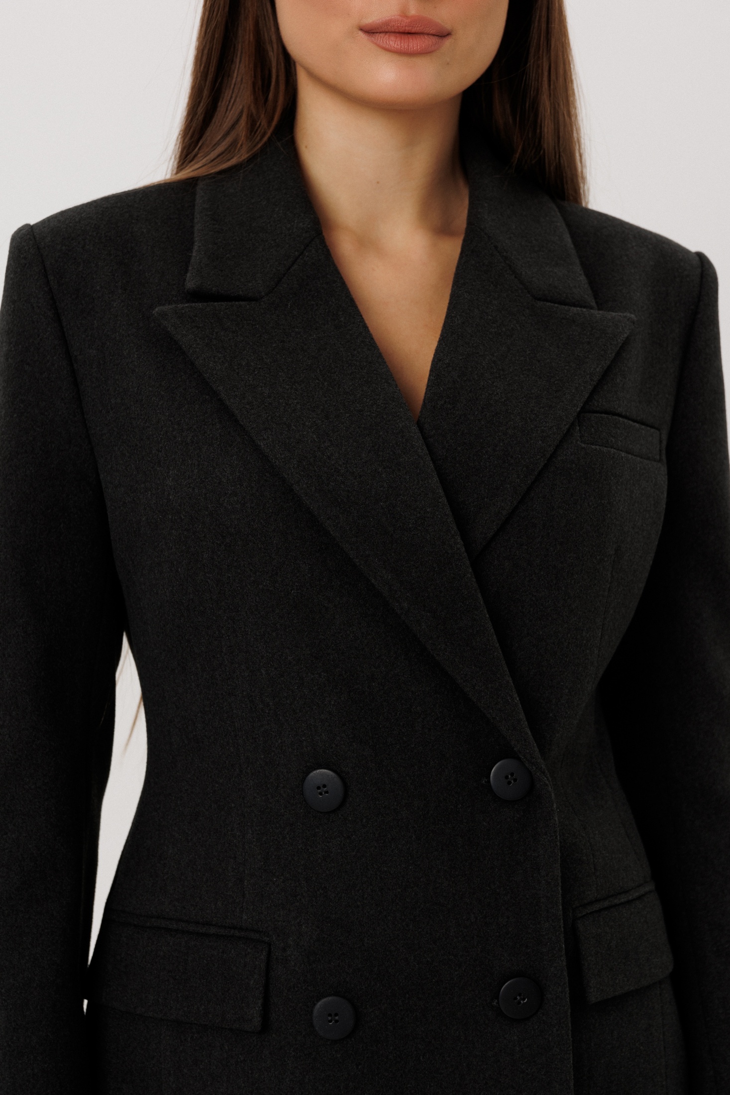 Элегантный двубортный жакет тёмно-серого цвета - идеальный выбор для создания делового образа. Жакет выполнен в полуприлегающем силуэте, что подчеркивает фигуру, сохраняя при этом утонченный вид. Длина модели по спинке составляет 75 см, а длина рукава - 61 см, обеспечивая комфортное прилегание. Модель украшена классическими лацканами, добавляя строгости и статусности облика. Функциональные карманы на панели добавляют практичности жакету, позволяя удобно разместить необходимые мелочи. Этот жакет станет основой для множества стильных и профессиональных ансамблей.