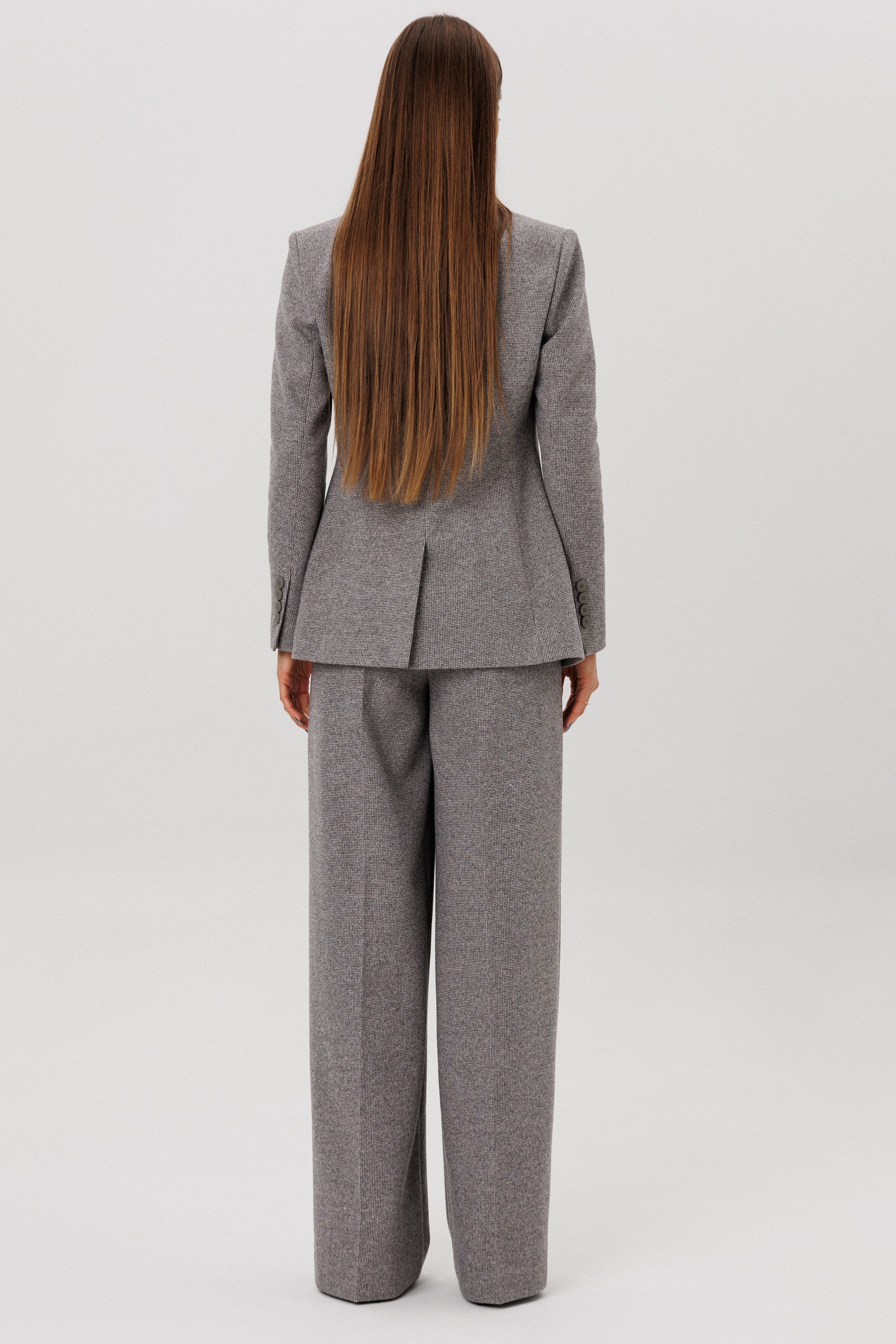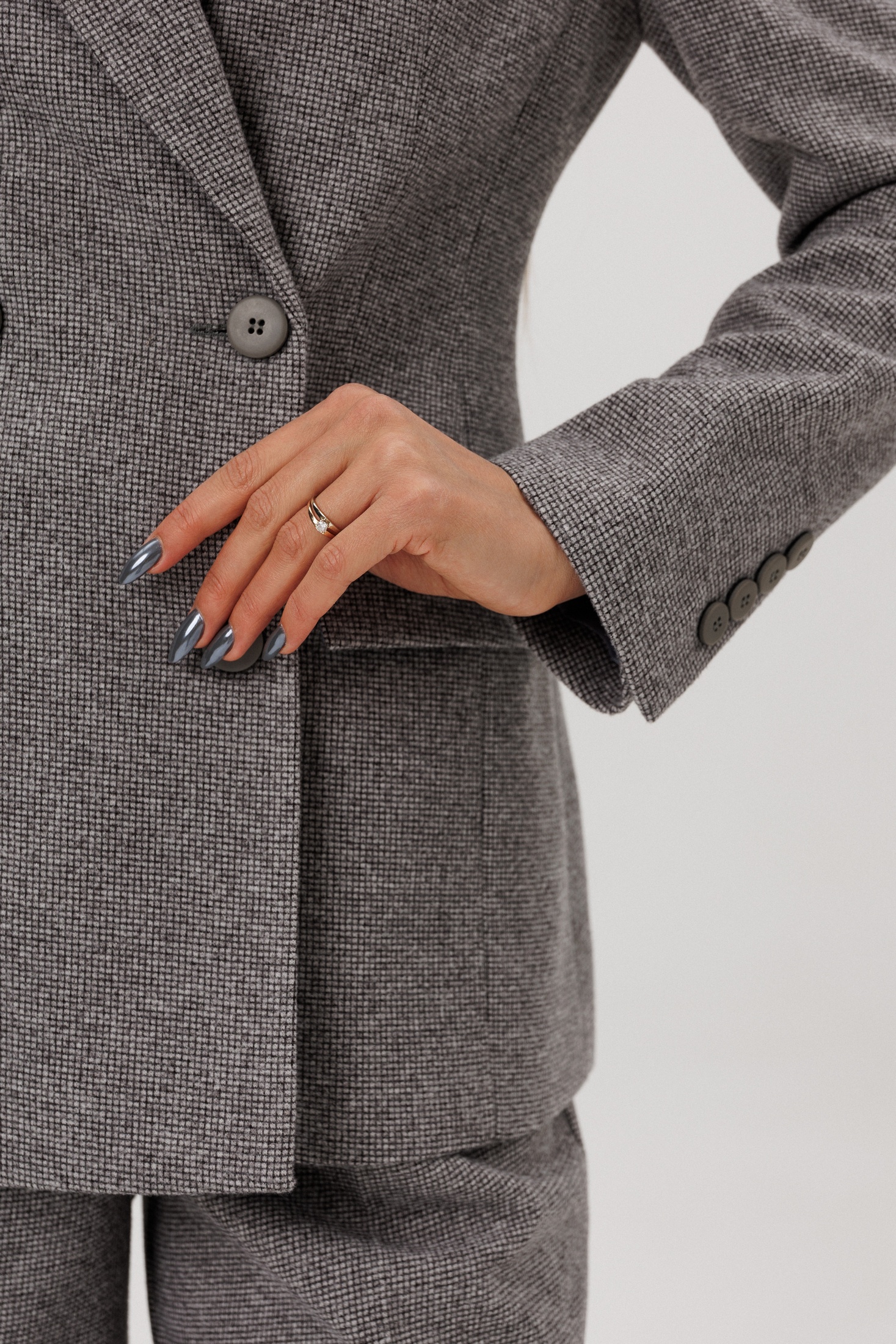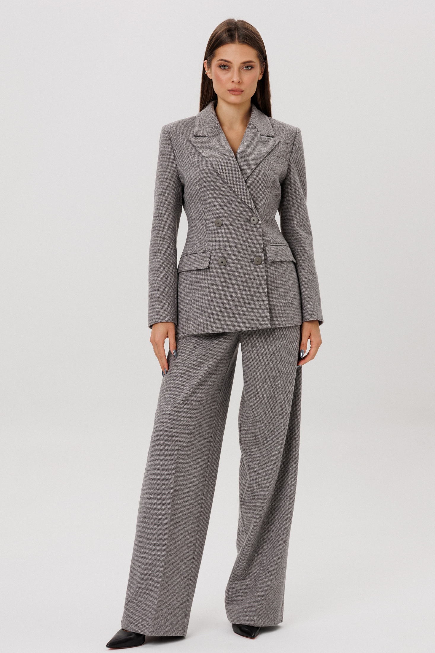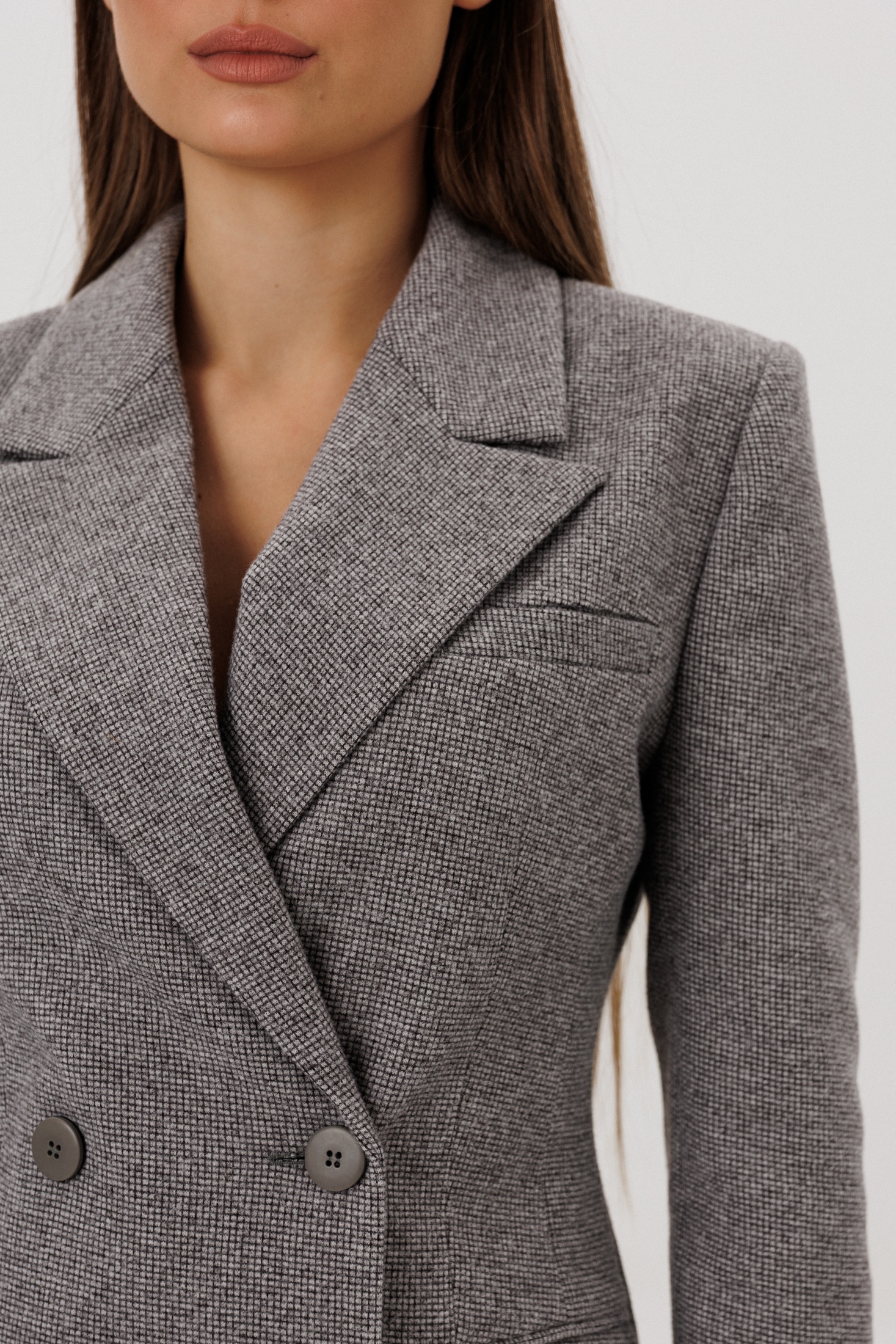 Элегантный серый двубортный жакет из мелкой шерстяной ткани. Жакет обладает полуприлегающим силуэтом, что подчеркивает фигуру, сохраняя при этом комфорт и свободу движений. Наличие функциональных карманов с клапанами добавляет практичности, а длинные рукава (61 см) и длина изделия по спинке (75 см) делают модель универсальной для любой фигуры. Контрастирующие темные пуговицы гармонично дополняют дизайн, делая акцент на двубортной застежке. Этот жакет идеально подойдет как для официальных встреч, так и для создания повседневных стильных образов.