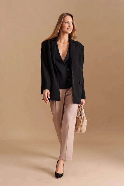 Жакет женский из костюмной ткани прямого силуэта, однобортный с фронтальной застёжкой на петли и пуговицы, длиной до линии бёдер.Перед с прорезными карманами с клапаном и верхним карманом с листочкой-имитация слева. Спинка с плечевыми вытачками и средним швом, в котором имеется шлица. Воротник пиджачного типа. Рукав длинный втачной двухшовный со шлицей. Жакет на подкладке.
