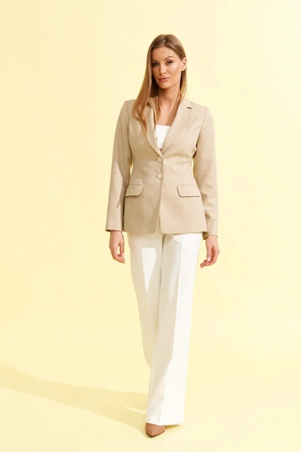 Жакет женский из шерстяной костюмной ткани на подкладке, прилегающего силуэта с втачным рукавом, центральной бортовой застежкой на 2 петли и 2 пуговицы, длиной ниже линии бедер. Полочки с вытачками, отрезными бочками и прорезными карманами с клапанами. Спинка со средним швом и отрезными бочками. Рукав длинный втачной двухшовный. Воротник пиджачного типа.