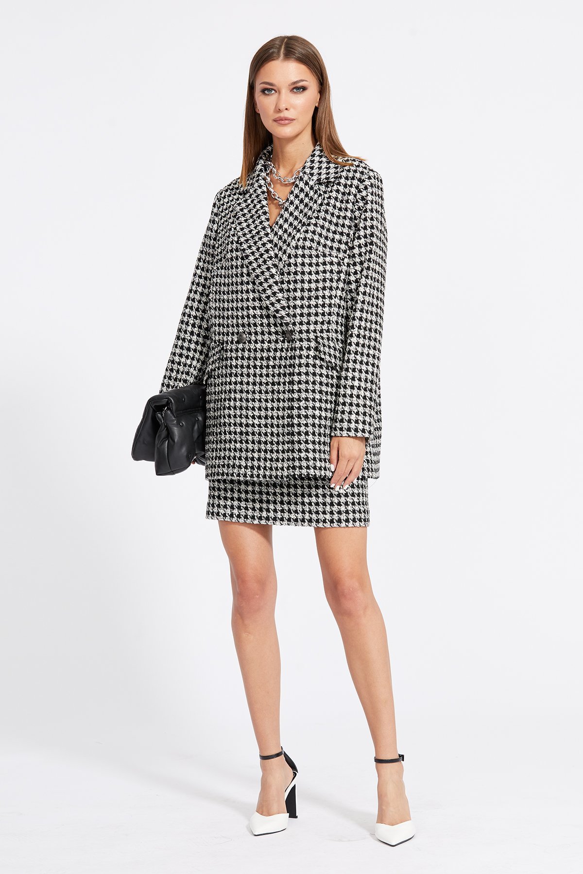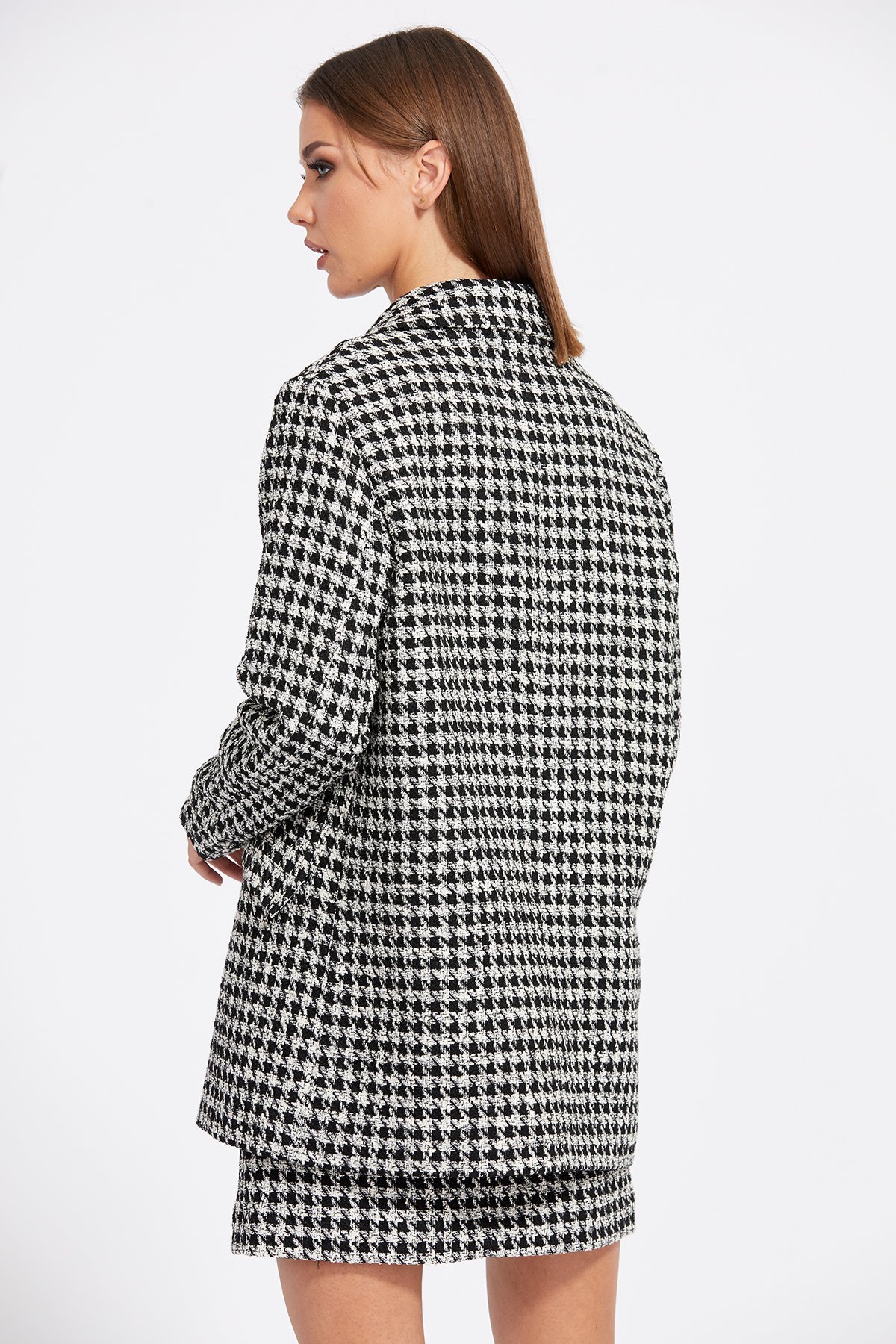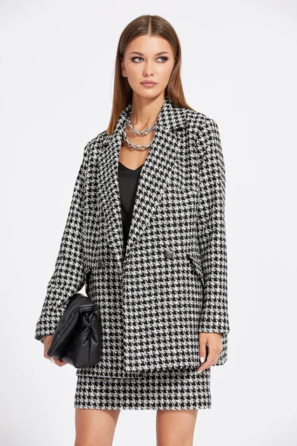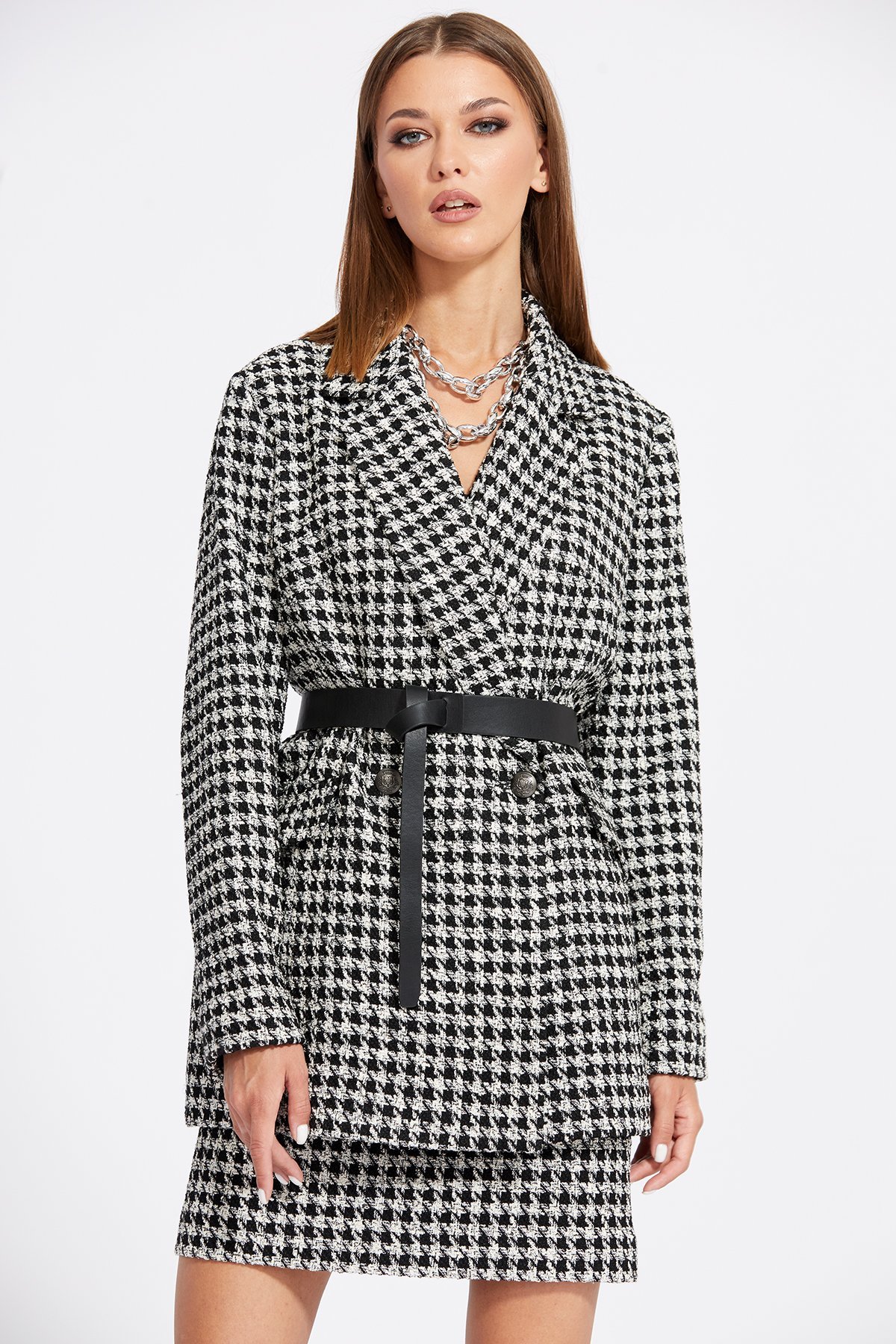 Жакет выполнен из костюмной ткани с рисунком "гусиная лапка". Жакет прямого силуэта, покроя оверсайз, длиной до линии бедер, Спереди двубортная застежка на две металлические пуговицы, лацканы, прорезные карманы с наклонным входом и клапаном. Спинка со средним швом. Воротником пиджачного типа. Рукав втачного покроя, двухшовный. Жакет на притачной по низу подкладке.РЕМЕНЬ В КОМПЛЕКТ НЕ ВХОДИТ.